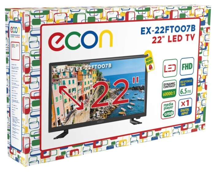 1080p Full HD (1920x1080); диагональ экрана 22"; частота обновления экрана 60 Гц; мощность звука 6 Вт (2х3 Вт); поддержка DVB-T2; HDMI, USB; настенное крепление (VESA) 100×100 мм; 509x340x165 мм