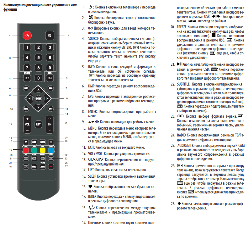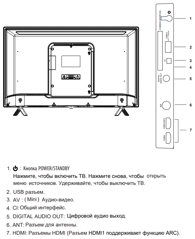 - Разъемы и интерфейсы: AV-вход, выход на наушники, вход HDMI x 2, USB Type-A, слот CI, выход аудио коаксиальный
