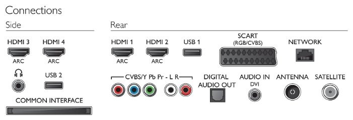 - Входы: AV, аудио x2, компонентный, SCART, RGB, HDMI x4, USB x2, Ethernet (RJ-45), Wi-Fi 802.11n, WiDi, Mira