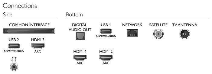 - Входы: HDMI x3, USB x2, Ethernet (RJ-45), Wi-Fi 802.11n, Miracast