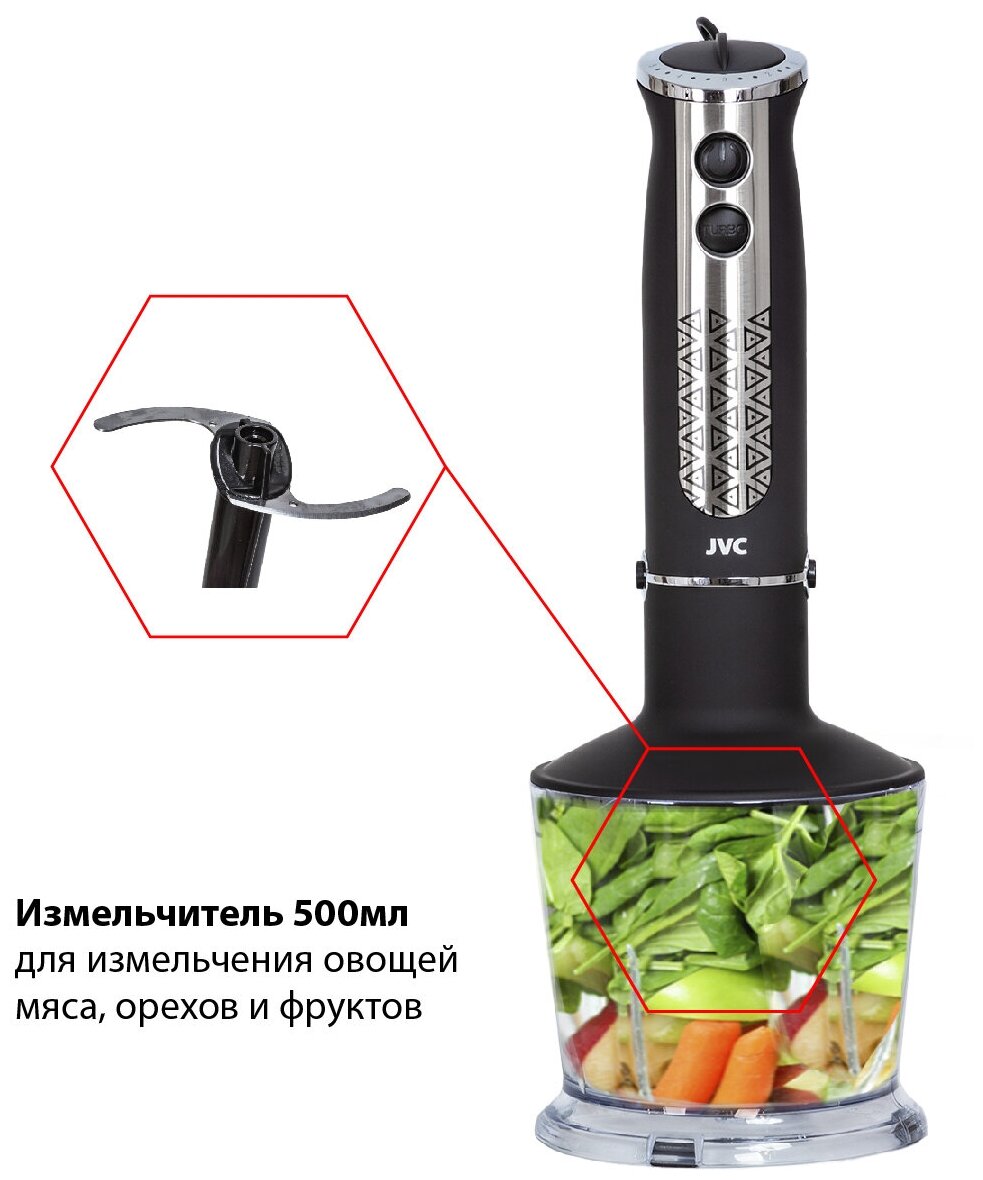 тип: погружной, максимальная мощность: 1200 Вт, насадки: венчик для взбивания, измельчитель, в комплекте: мерный стакан, режимы: турборежим, емкость измельчителя: 0.50 л