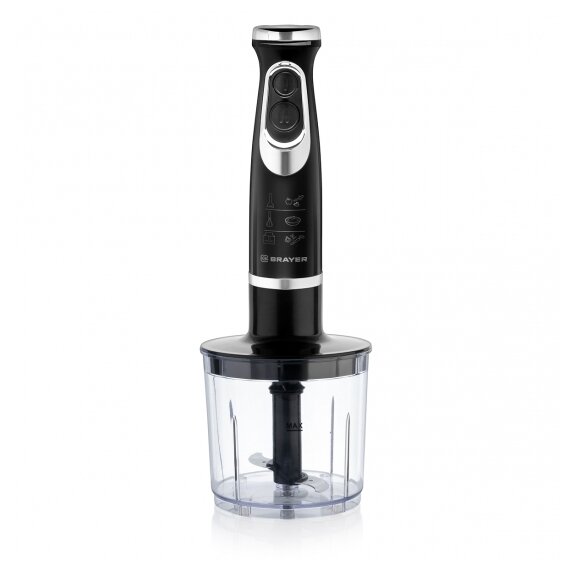 тип: погружной, максимальная мощность: 800 Вт, материал погружной части: металл, насадки: венчик для взбивания, измельчитель, в комплекте: мерный стакан, дополнительные функции: плавная регулировка скорости, емкость измельчителя: 0.35 л, количество скоростей: 2