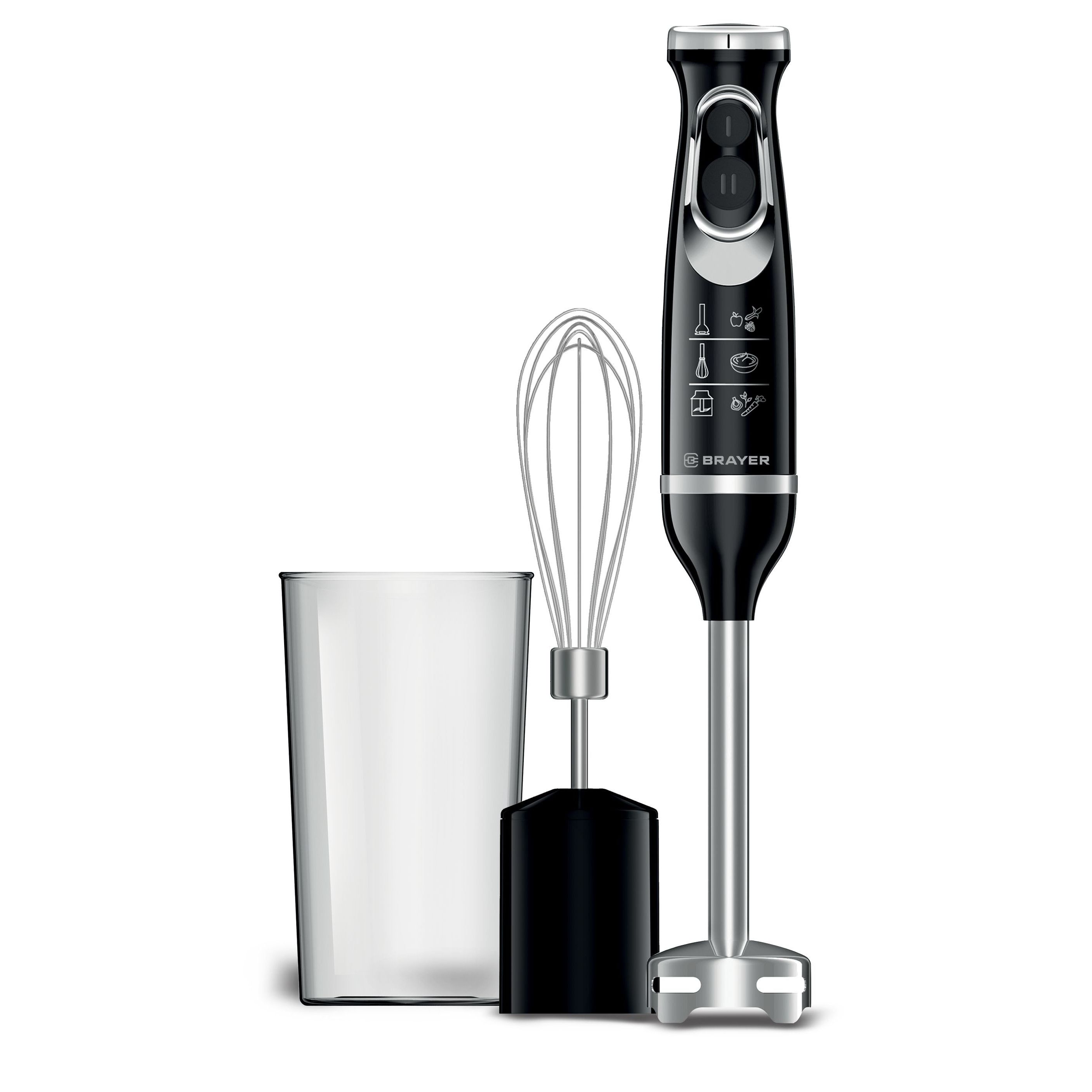 Описание; Особенности: ; Погружная часть и лезвия из нержавеющей стали; Корпус из пластика, декорирован нержавеющей сталью; Плавная регулировка скорости; Насадка-венчик для взбивания; Насадка-блендер для измельчения и смешивания; Технические данные: ; Тип блендера: погружной; Количество скоростей: 2; Мощность: 800 Вт ; Стакан для смешивания: 700 мл; Электропитание: 220-240 В, ~ 50-60 Гц