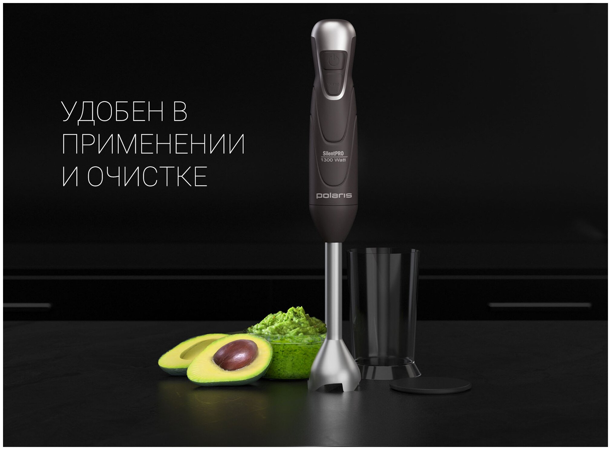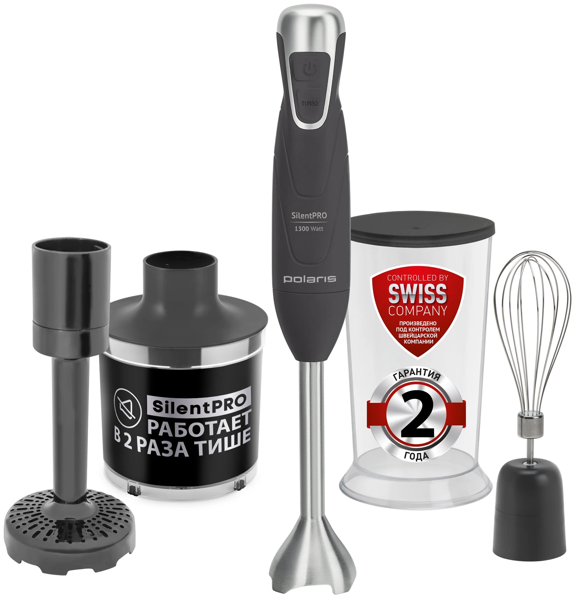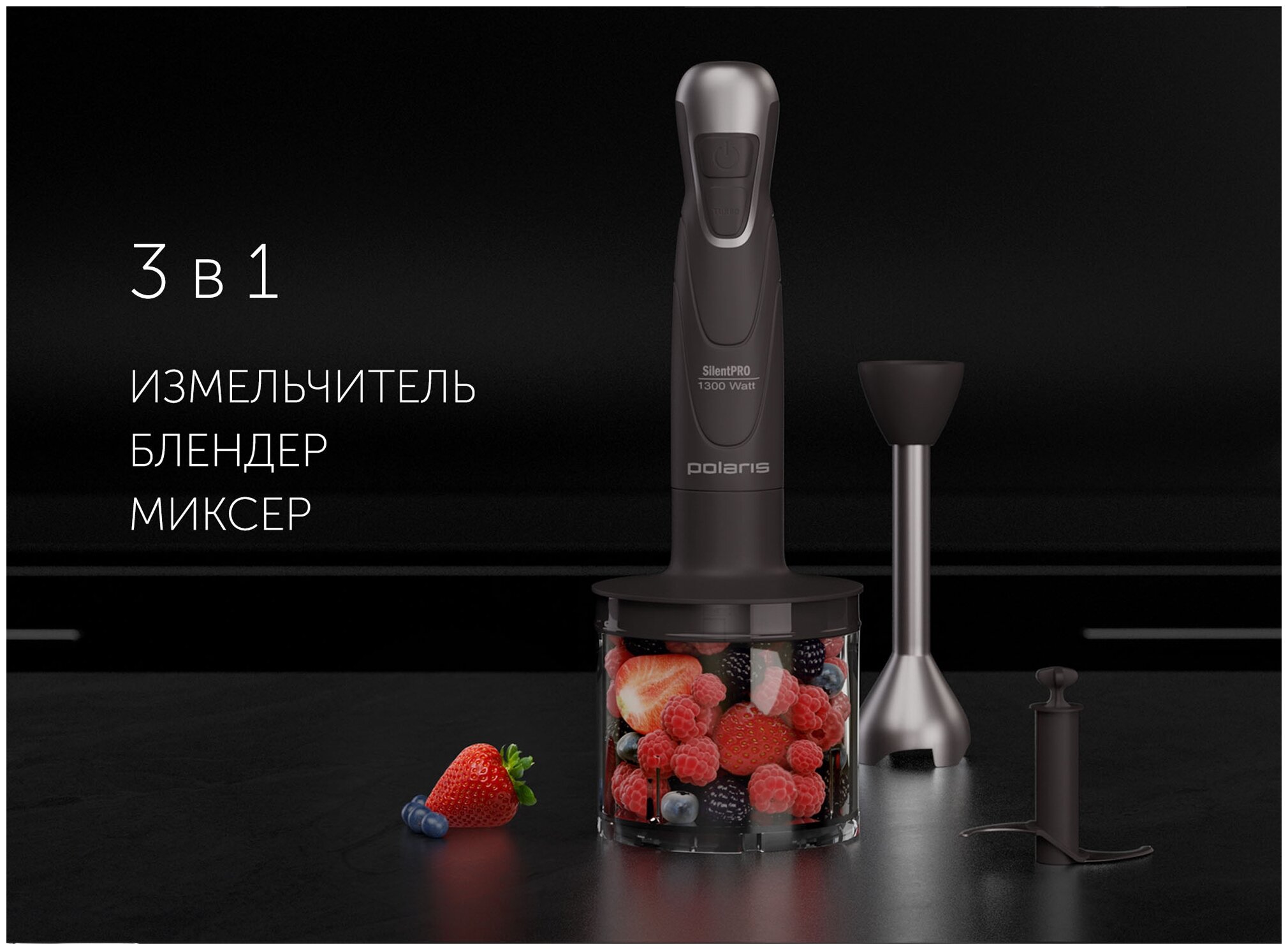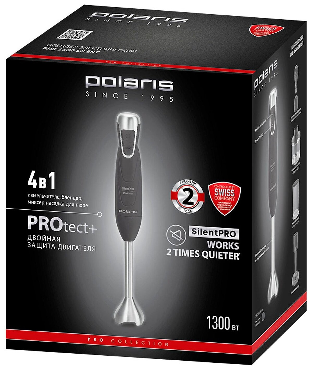 Погружной блендер Polaris PHB 1380 Silent – компактный и многофункциональный прибор, который позволит решить даже сложные кулинарные задачи без особого шума. Работает в 2 раза тише в сравнении с блендерами Polaris старого поколения благодаря технологии SilentPRO. Интересен высокой мощностью 1300 Вт и комплектацией 4 в 1: блендер, измельчитель, миксер и насадка для пюре. Также в наборе вместительный мерный стакан 0,7 л с крышкой и чаша измельчителя объемом 0,5 л.