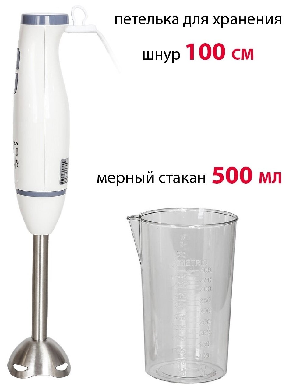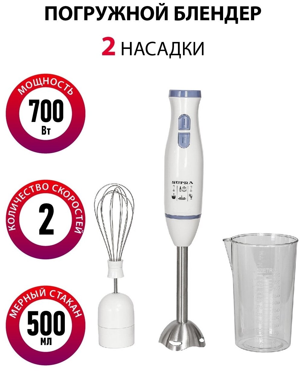 тип: погружной, максимальная мощность: 700 Вт, материал погружной части: металл, насадки: венчик для взбивания, в комплекте: мерный стакан, количество скоростей: 2, особенности конструкции: Кнопка для быстрого снятия насадок