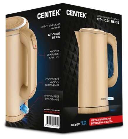 Чайник Centek CT-0020 Beige металл 1.7л, 2200W, двойные стенки, кнопка откр. на ручке