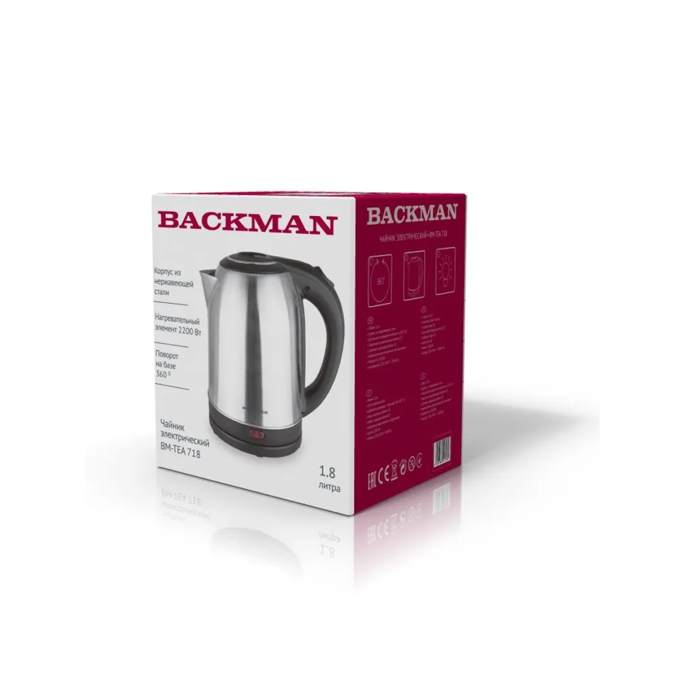 Электрочайник BACKMAN BM-TEA 718 1,8 л, корпус из высококачественного термостойкого стекла и пластика, закрытый нагревательный элемент, вращение подставки на 360°, световой индикатор работы, шкала уровня воды, автоматическое отключение при закипании, автоматическое отключение без воды. : Тип: электрический чайник : Материал корпуса: металл : Объем, л: 1.8 : Мощность, Вт: 2200 : Тип управления: механическое : Особенности устройств для нагрева воды: вращение подставки на 360°, светоиндикатор работы : Системы защиты: автоотключение, защита от перегрева, автоотключение при отсутствии воды : Цвет: серебристый ;
