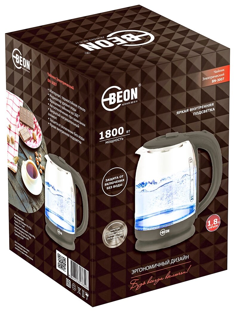 тип: чайник, материал корпуса: пластик/стекло, объем: 1.80 л, тип нагревательного элемента: закрытая спираль, особенности: вращение на 360 градусов, индикатор уровня воды, фильтр, отсек для хранения шнура