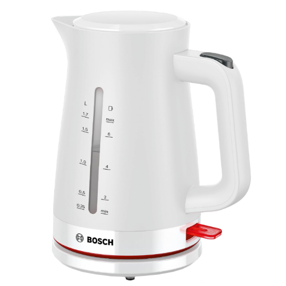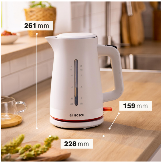 Чайник Bosch MyMoment TWK3M121-идеальное устройство для всех любителей хорошего чая и кофе. Бренд Bosch уже много лет славится качеством своей продукции, и этот чайник является прекрасным примером этого. Он имеет емкость 1,7 литра, поэтому вы можете приготовить нужное количество горячей воды для себя и своих гостей. Мощность 2400 Вт позволяет воде быстро кипеть, что особенно полезно в ситуациях, когда у нас мало времени. Изготовленный из пластика, чайник легкий и простой в эксплуатации, а плоский нагреватель гарантирует равномерный и быстрый нагрев воды. Благодаря белому цвету он идеально впишется в любую кухню.: Этот чайник имеет множество функций, которые обеспечивают безопасность использования. Автоматическое выключение при снятии с основания, защита от перегрева, включение без воды и кипячения защищают от возможных опасностей. Нескользящая основа обеспечит стабильность устройства на любой поверхности. Кроме того, анти-посадочный фильтр устраняет загрязнения из воды, а индикатор уровня воды позволяет точно