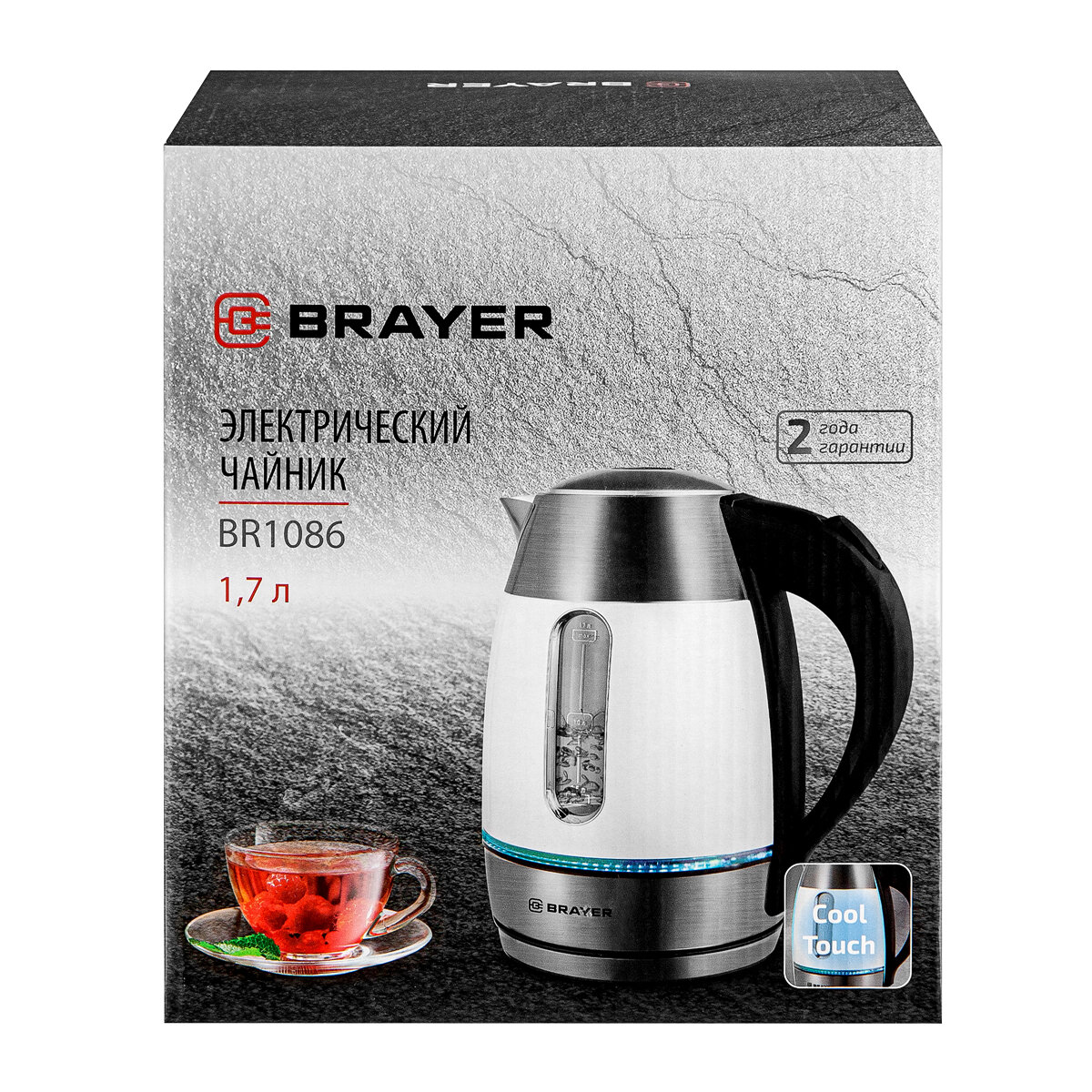 Чайник электрический BRAYER 1086BR 2200 Вт 1.7 л Cool Touch автоотключение BR1086 предназначен для использования в офисе или дома.: Быстро кипятит воду, что экономит время.: Современный дизайн впишется в любой интерьер.: За счет прочного корпуса чайник прослужит долго.: Технические характеристики: Объем: 1.7 л: Тип управления: механический: Дистанционное управление: нет: Мощность (Вт): 2200: Материал корпуса: пластик, стекло: Цвет корпуса: белый, серый: Палитра: белый: Фильтр от накипи: есть: Фильтр в носике: есть: Нагревательный элемент: дисковый: Температурные режимы: 100 °С: Защита от включения без воды: есть: Подсветка воды: да: LED-индикатор работы: да: Диаметр: 18.7 см: Высота: 25 см: Вес нетто: 1.53 кг: Тип крышки: механический: Регулировка температуры нагрева воды: да: Поддержание температуры: нет: Отключение при снятии с подставки: да: Отложенный старт: нет: Мерная шкала: да: Вращение на подставке: да: Звуковой сигнал: нет: Встроенный заварник: нет: Рисунок на корпусе: нет: Дисплей: нет;