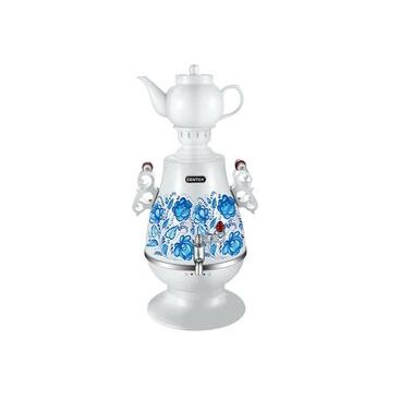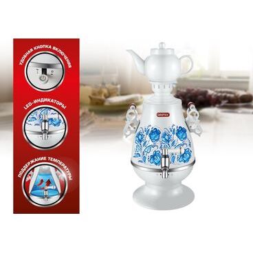 Цвет белый / рисунок: Отделка хром: Тип самовар: Объем основного бака 4.0 л: Объем заварника 1.0 л: Технические хар-ки : Потребляемая мощность 2300 Вт: Нагревательный элемент скрытый: Покрытие нагревательного элемента нержавеющая сталь: Поддержка температуры есть: Индикация закипания воды есть: Тип индикации закипания визуальная: Индикация работы есть: Безопасность : Автоотключение без воды есть: Отключение при закипании есть: Защита от перегрева есть: Общее : Материал сталь: Материал краника металл: Материал заварника керамика: Длина сетевого шнура 1.2 м;