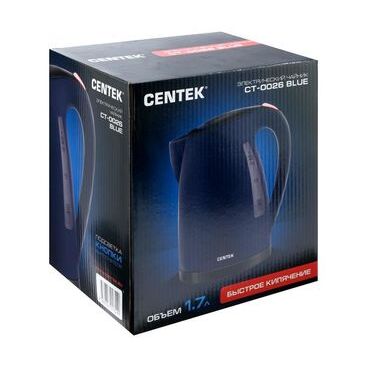 Тип электрочайник: Модель Centek CT-0026 Синий: Основные характеристики: Объем 1.7 л: Мощность 2200 Вт: Материал корпуса пластик: Тип нагревательного элемента скрытый нагревательный элемент: Фильтр в носике есть: Комфорт: Шкала уровня воды есть: Индикация включения: Вращение на подставке есть: Автоотключение есть: Дополнительная информация: Защита защита от включения без воды: Особенности подсветка кнопки включения, быстрое кипячение;