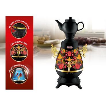 Тип самовар Дизайн ретро Объем 4 л Потребляемая мощность 2300 Вт Нагревательный элемент скрытый Покрытие нагревательного элемента нержавеющая сталь Съемная крышка Материал сталь