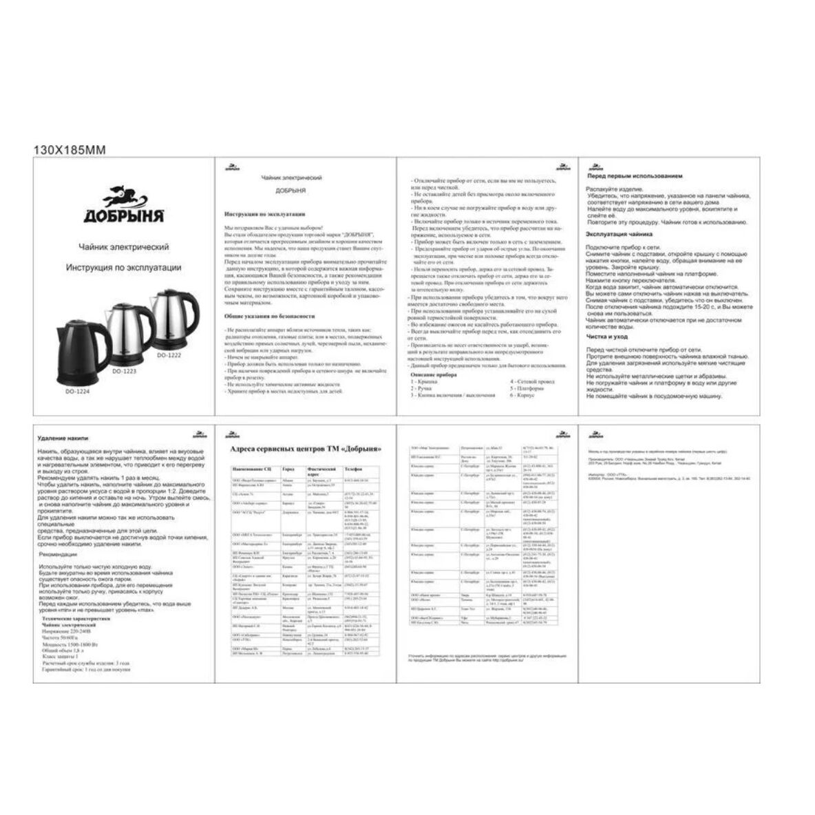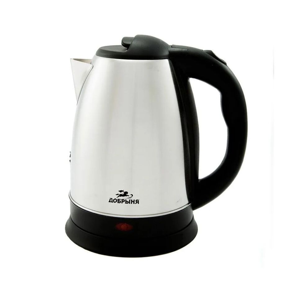 Электрический чайник ДОБРЫНЯ является прекрасным решением для тех, кто любит устраивать себе перерывы в работе на чашечку чая или кофе. Он прост в управлении и долговечен в использовании. Чайник автоматически выключается при закипании.;Объем, л1.8Мощность, Вт1800Материал корпусаМеталлТип управленияМеханическоеПодсветкаНетТип нагревательного элементаЗакрытая спиральКонструкция чайникаСветоиндикатор работыАвтоотключениеДаЦветЧерныйУправление со смартфонаНет ;