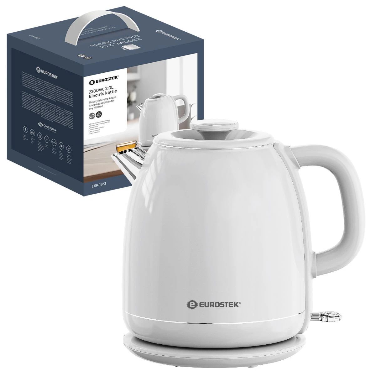 Электрический чайник Eurostek EEK-1833 : Объем: 2,0 л : Мощность: 2200 Вт : Материал: пластик/нержавеющая сталь : Цвет: белый : Поддержание температуры: нет : Вращение на подставке: да : Автоматическое выключение: да : Защита от перегрева: да : Индикатор работы/готовности: да : Размер потребительской коробки, мм (ШхГхВ): 215*210*220 : Технология двухслойного корпуса COOL TOUCH : Дисковый нагревательный элемент : Длина шнура: 0,9 м : Световая индикация работы : Вращения чайника на подставке на 360 : Автоматическое отключение при закипании и при недостаточном количестве воды ;