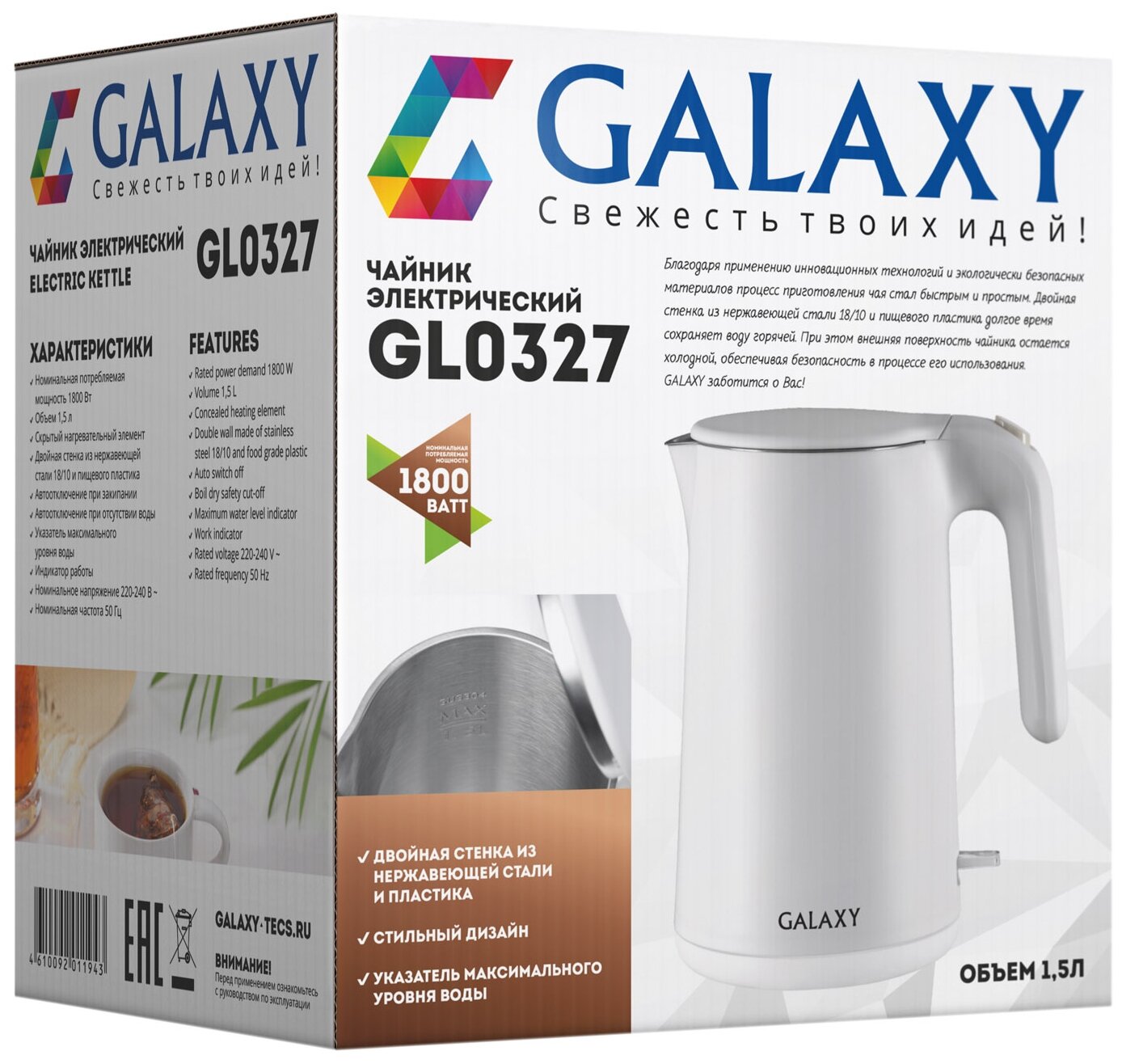 тип: чайник, материал корпуса: металл/пластик, объем: 1.50 л, тип нагревательного элемента: закрытая спираль, особенности: двойные стенки, индикация включения, отсек для хранения шнура