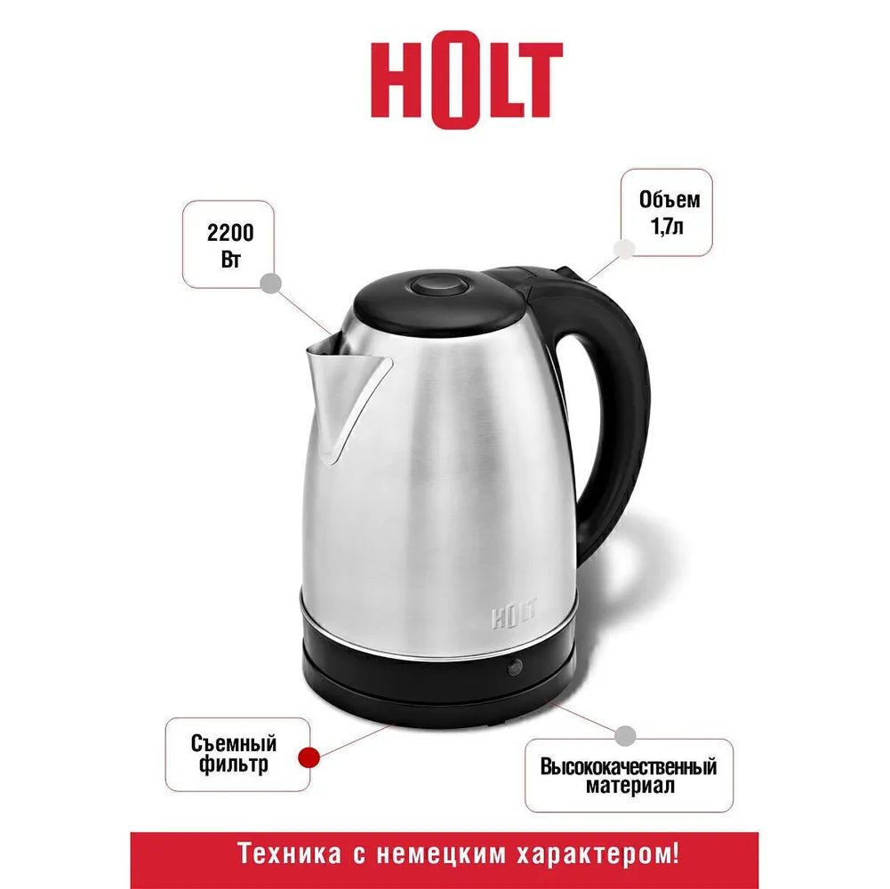 Бренд : Holt : Цвет товара : вишня, черный : Тип : чайник : Объем : 1.6 л : Мощность : 2200 Вт : Тип нагревательного элемента : закрытый : Покрытие нагревательного элемента : нержавеющая сталь : Безопасность : блокировка включения без воды, отключение при снятии с подставки : Дополнительные характеристики : Особенности : вращение на 360 градусов, индикация включения, отсек для хранения шнура, фильтр : Материал корпуса : металл ;