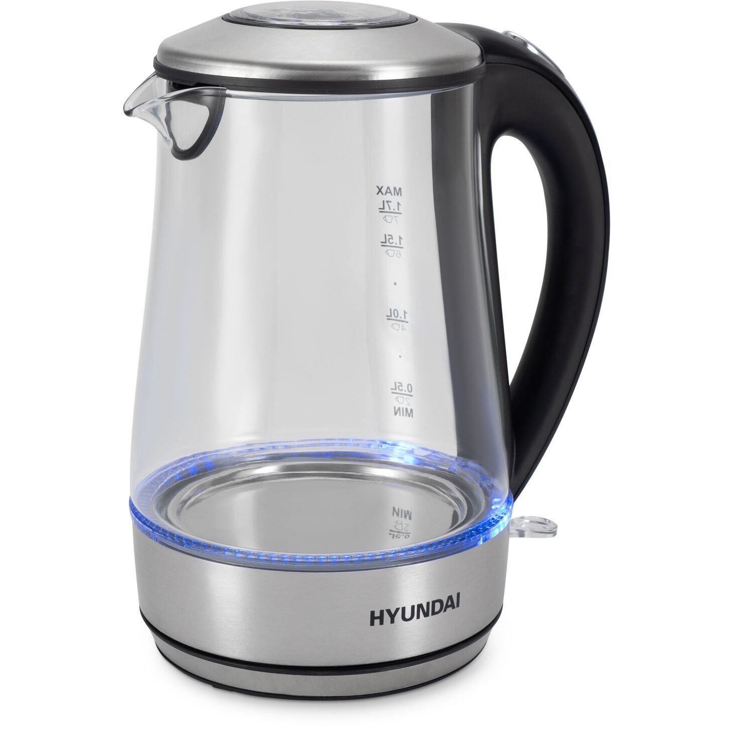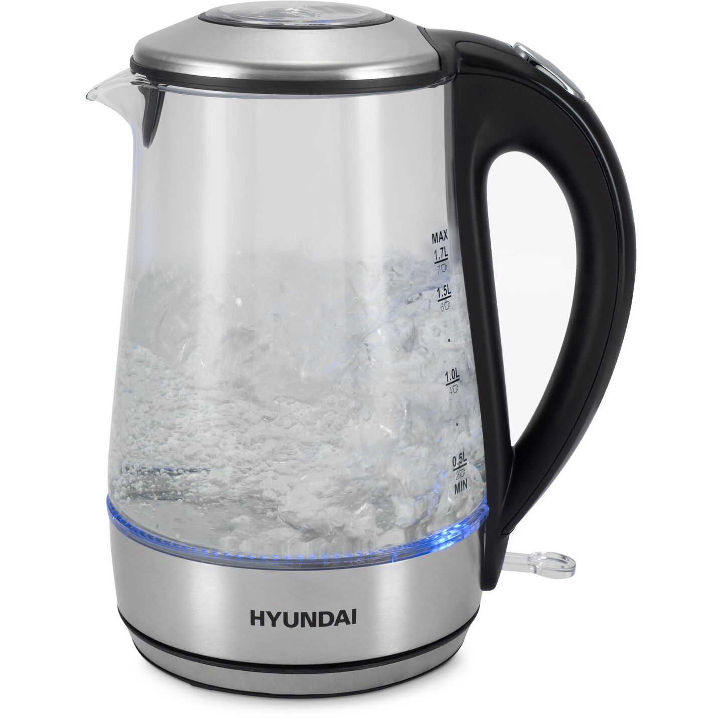 Стеклянно-металлический электрический чайник Hyundai HYK-G8406 объемом 1,7 л и мощностью 2200 Вт позволит быстро вскипятить 0,5-1,7 л воды. Модель оснащена голубой подсветкой и функцией автоматического отключения нагрева при закипании, а также встроенным фильтром от накипи. : Корпус из стекла и стали. Комбинированный корпус со стеклянной колбой и элементами из нержавеющей стали в основании и крышке обеспечивает чайнику презентабельный внешний вид, а боросиликатное стекло не вступает в реакцию с водой и не выделяет примесей и запаха. : Декоративная подсветка. Включающиеся во время нагрева и гаснущие при отключении чайника светодиоды придают ему дополнительную привлекательность и служат индикатором состояния. : Мерная шкала на колбе. Отметки на колбе с указанием объема воды и соответствующего ему количества стандартных порций помогут точно отмерить необходимое количество наливаемой воды. : Автоматическое отключение. Электрочайник отключится автоматически, когда вода достигнет температуры кипения, или если её ко