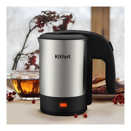 Электрический чайник Kitfort КТ-6190 предназначен для кипячения воды дома, в офисе, на даче. Мощность прибора позволяет использовать его в домах со слабой проводкой. Чайник компактный, поэтому не займет много места, если брать его с собой. Кроме того, прибор позволит быстро вскипятить небольшое количество воды. Полный чайник закипает примерно за 3 минуты.: Корпус чайника выполнен из нержавеющей стали, а крышка — из пластика. Ручка чайника пластиковая, не нагревается и удобно лежит в руке. Съемная крышка облегчает доступ во время мытья чайника.: Управление осуществляется с помощью кнопки «Вкл/Выкл», которая расположена на ручке. При включении чайника загорается индикатор нагрева.: Нагревательный элемент (ТЭН) у этой модели чайника скрытый и находится в донной части. Сверху он закрыт специальной металлической пластиной из нержавеющей стали, благодаря которой исключается прямой контакт ТЭНа с водой. Такая конструкция препятствует образованию накипи, облегчает уход и значительно снижает шум при нагревании воды.: