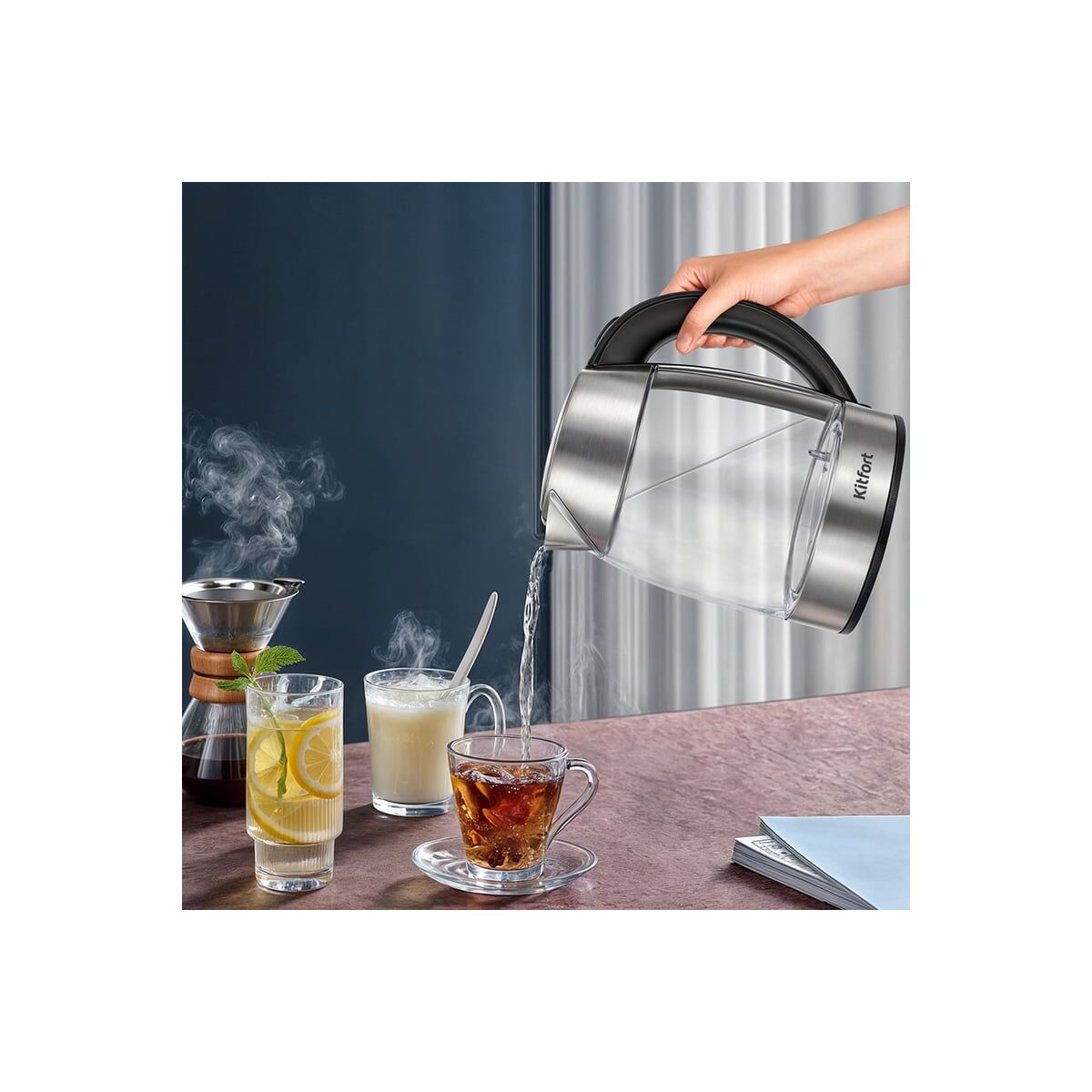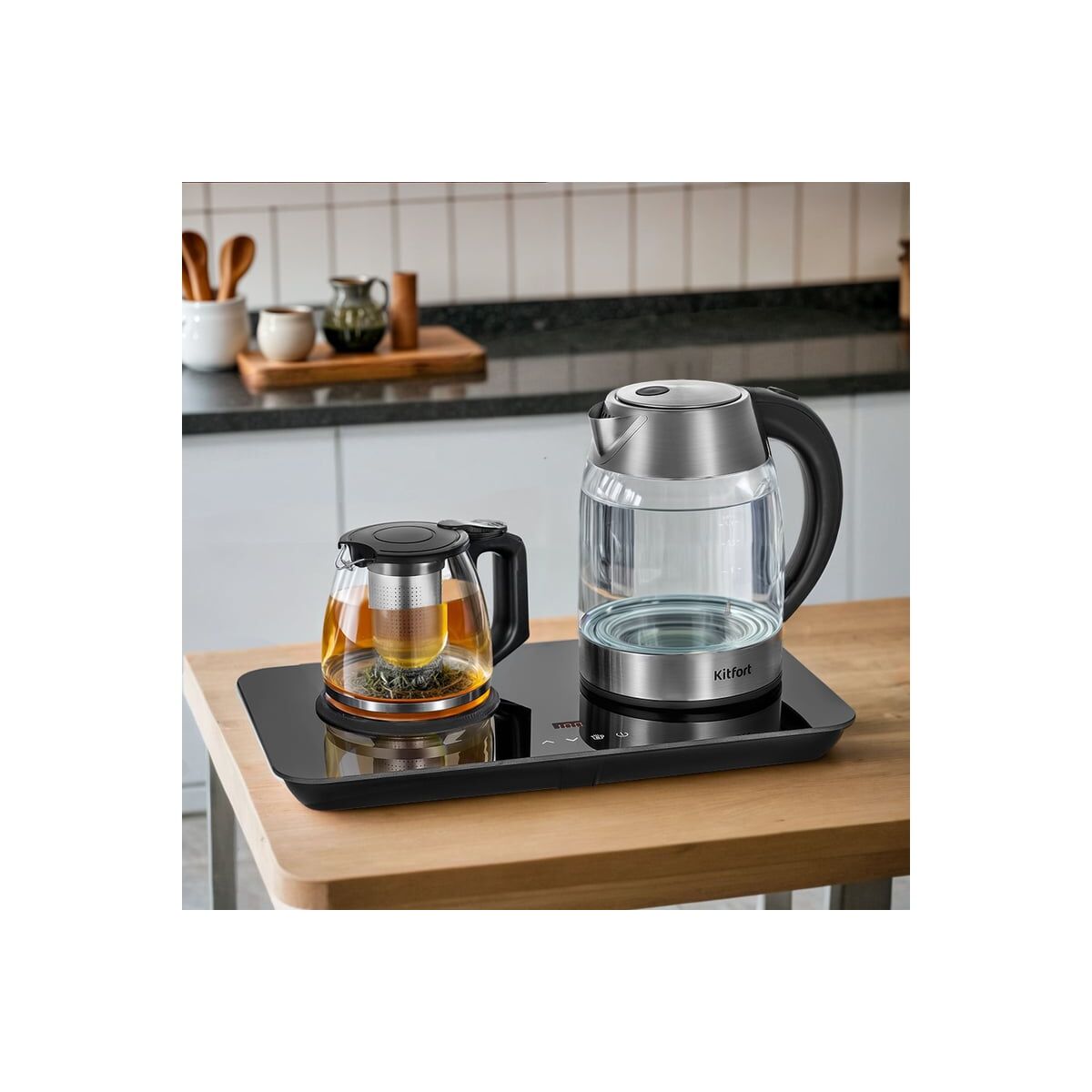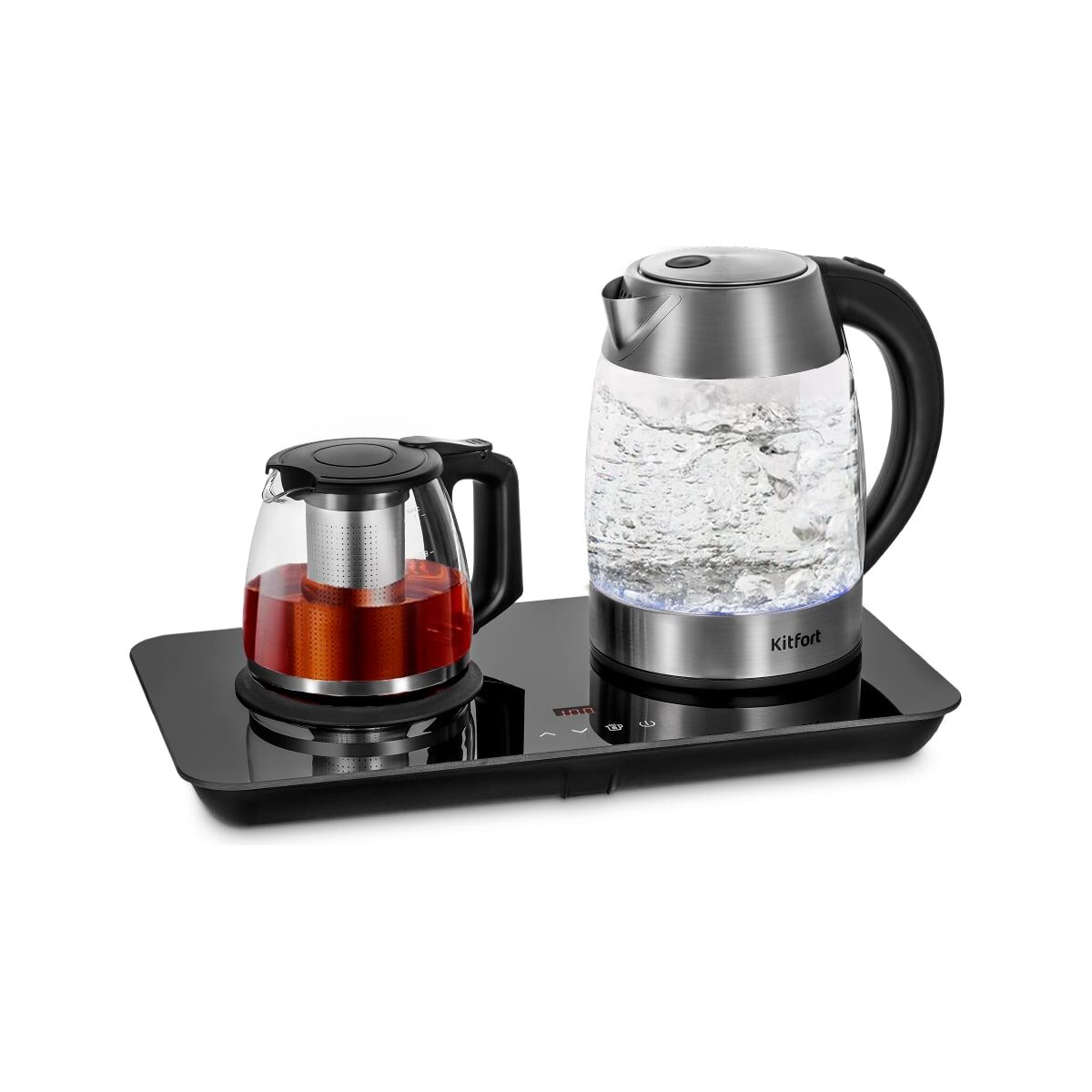 Чайный наборKitfort КТ-6608 состоит из чайника емкостью 1,7 л, заварочного чайника с фильтром для заварки емкостью 1 л и базы. Набор поможет вам не только вскипятить воду, но и нагреть ее до температуры 50, 60, 70, 80, 90 °C. Вы можете заварить чай или кофе, а также сохранять готовый напиток теплым. : Чайник : Корпус чайника выполнен из стекла, нержавеющей стали и пластика. Крышка выполнена из пластика и нержавеющей стали. Ручка чайника пластиковая, что позволяет комфортно и удобно держать чайник в руке, не боясь, что он выскользнет. Конструкция чайника не позволяет ручке нагреваться, поэтому браться за нее абсолютно безопасно. : Нагревательный элемент (ТЭН) у чайника скрытый и находится в донной части. Сверху он закрыт специальной металлической пластиной из нержавеющей стали, благодаря которой исключается прямой контакт ТЭНа с водой. Такая конструкция препятствует образованию накипи, облегчает уход и снижает шум при нагревании воды. : Центральный контакт для чайника на базе дает возможность ставить чайник на