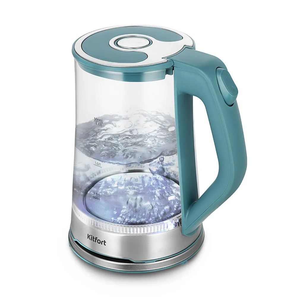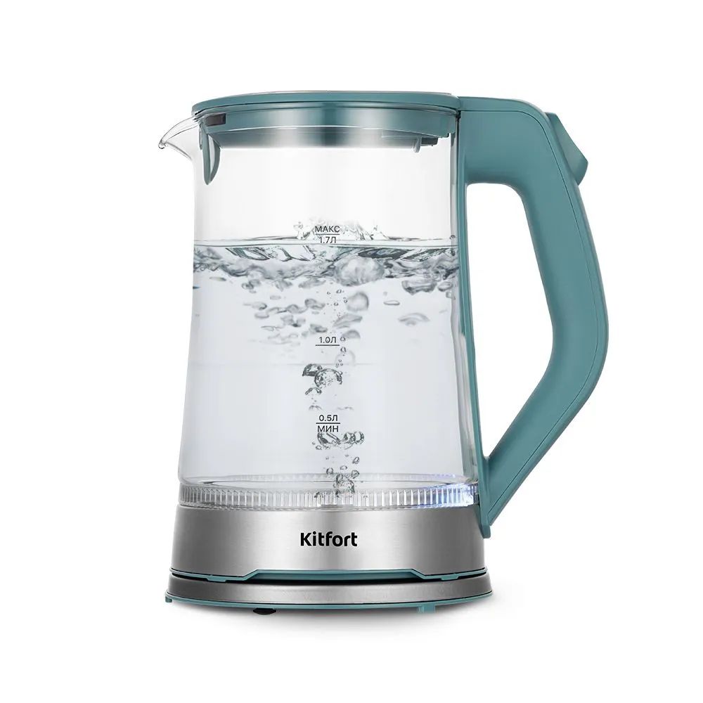 Мощность ; 1850–2200 Вт ; Емкость ; 1,7 л ; Материал корпуса ; стекло ; Материал крышки ; пластик + нерж. сталь ; Бренд Kitfort Цвет товара серебристый/бирюзовый Тип нагревательного элемента закрытый Подсветка есть Безопасность блокировка включения без воды, отключение при снятии с подставки Дополнительные характеристики Особенности вращение на 360 градусов, индикатор уровня воды, индикация включения, отсек для хранения шнура Длина шнура ; 0,6 м ; Размер устройства ; 223 х 167 х 248 мм ; Размер упаковки ; 215 х 175 х 245 мм ; Вес нетто ; 1,1 кг ; Вес брутто ; 1,4 кг ;