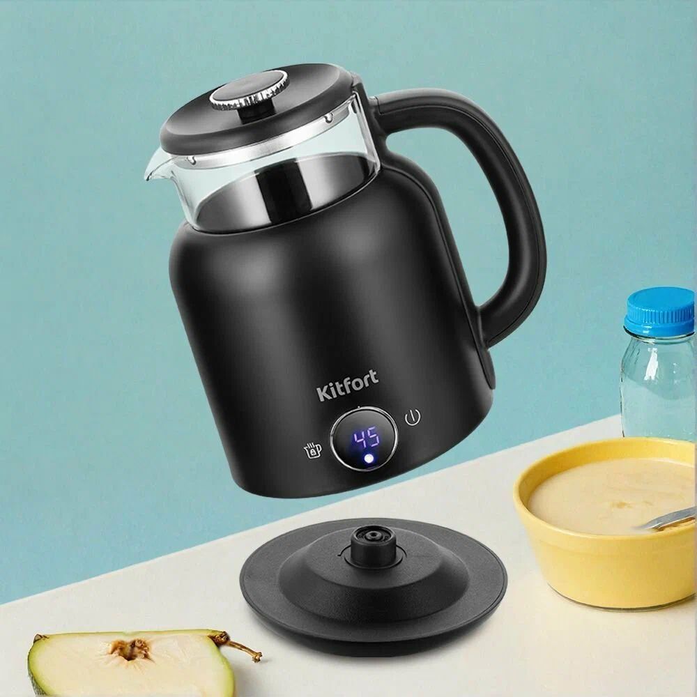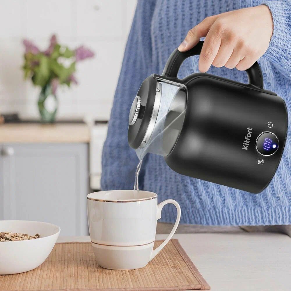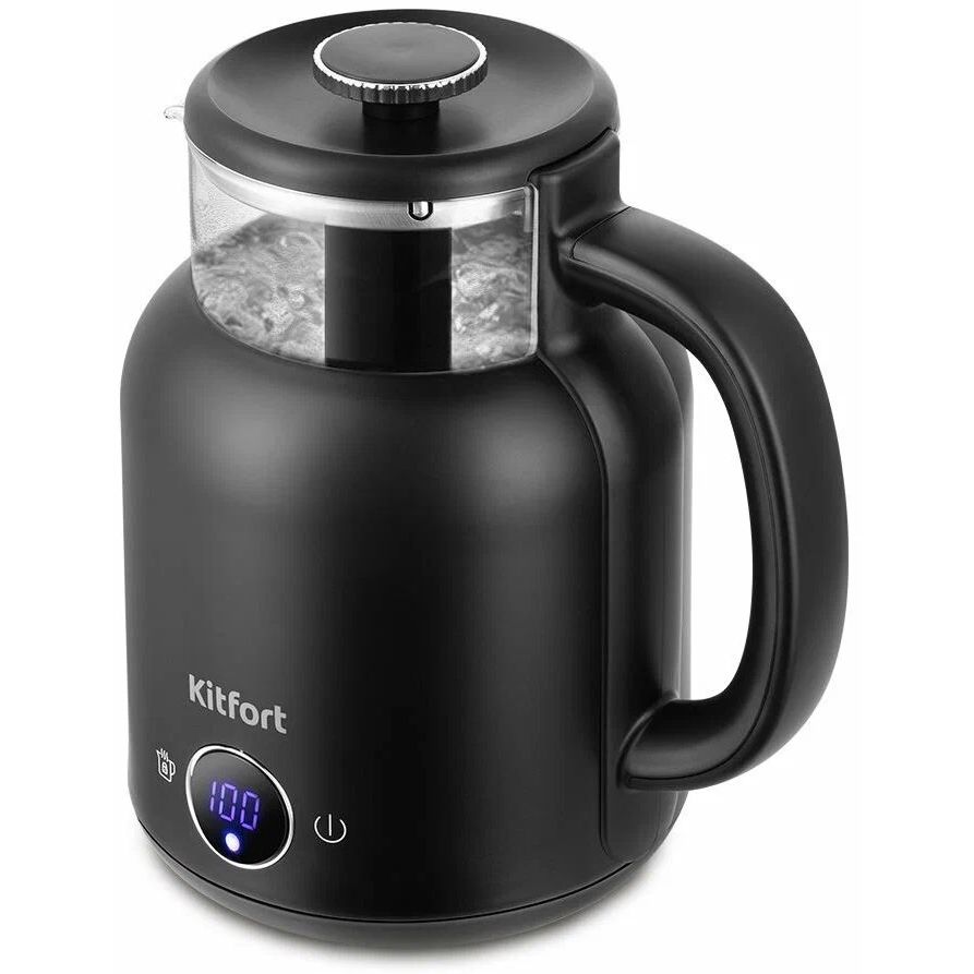 Основные характеристики Бренд Kitfort Цвет товара черный Тип чайник Мощность 1200 Вт Тип нагревательного элемента закрытый Безопасность блокировка включения без воды, отключение при снятии с подставки Дополнительные характеристики Особенности вращение на 360 градусов, дисплей, отсек для хранения шнура Возможность выбора температуры есть Материал корпуса пластик Материал колбы стекло