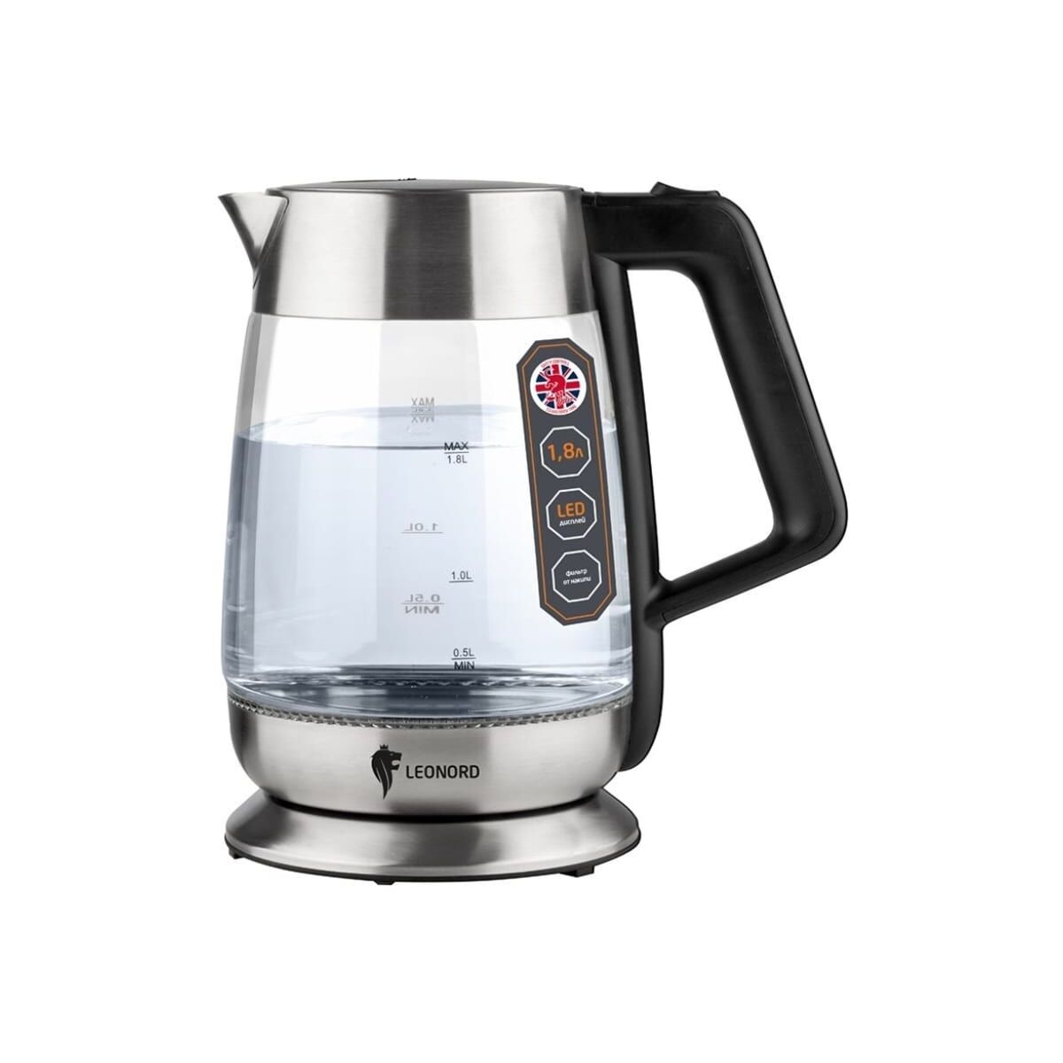 Электрический чайник Leonord LE- 1508 1.8 л стекло, пластик 104866 предназначен для использования в офисе или дома.: Хорошо держит температуру, благодаря чему вода дольше остается горячей.: Современный дизайн впишется в любой интерьер.: Чайник не ржавеет, за счет чего прослужит долго.: Технические характеристики: Объем: 1.8 л: Мощность (Вт): 2200: Материал корпуса: стекло, пластик: Фильтр от накипи: есть: Фильтр в носике: есть: Цвет корпуса: прозрачный/стальной: Защита от включения без воды: есть: Подсветка воды: да: LED-индикатор работы: да: Тип управления: механический: Нагревательный элемент: закрытый (спираль): Высота: 25 см: Диаметр: 17,5 см: Вес нетто: 1,437 кг: Регулировка температуры нагрева воды: нет: Мерная шкала: да: Вращение на подставке: да: Звуковой сигнал: нет;