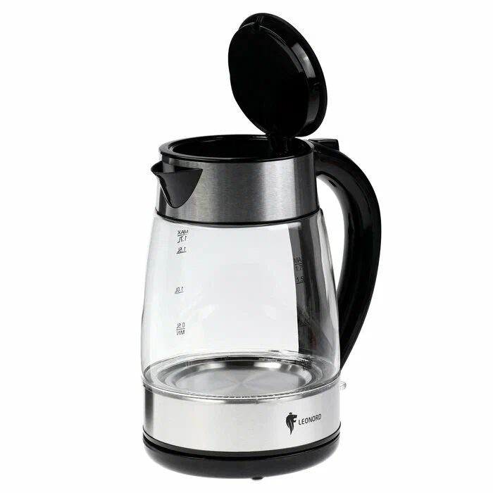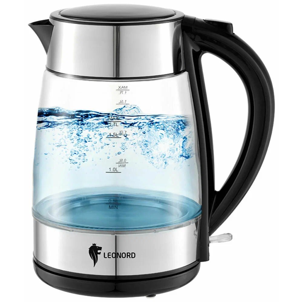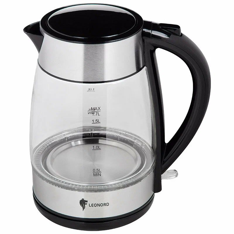 Бренд : LEONORD : Цвет товара : прозрачный/серебристый : Тип : чайник : Объем : 1.7 л : Мощность : 2200 Вт : Тип нагревательного элемента : закрытый : Подсветка : есть : Безопасность : блокировка включения без воды, отключение при снятии с подставки : Дополнительные характеристики : Особенности : вращение на 360 градусов, индикатор уровня воды, фильтр : Материал корпуса : стекло, нержавеющая сталь : Размеры и вес : Вес : 1.5 кг ;