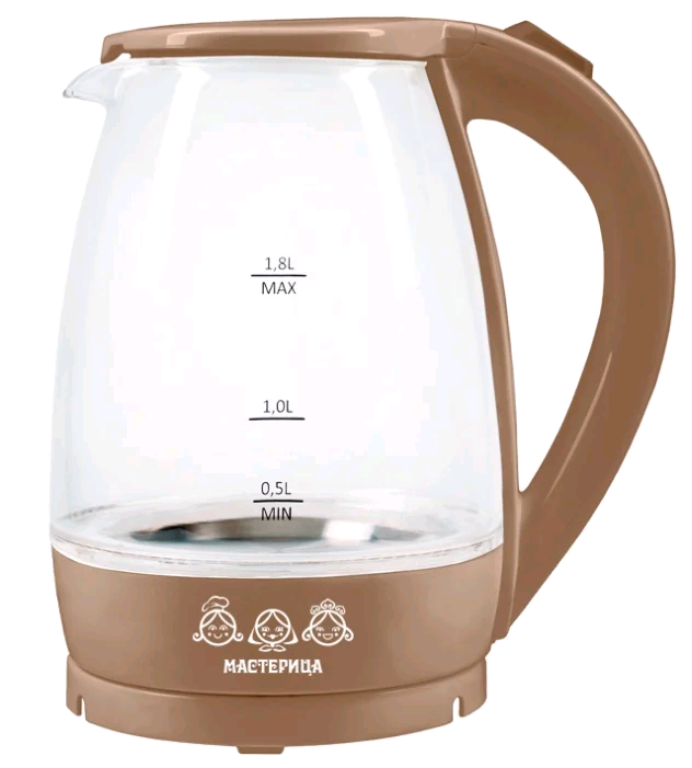 объем 1.8 л; мощность 1850 Вт; индикация включения; закрытая спираль; установка на подставку в любом положении; корпус из пластика и стекла