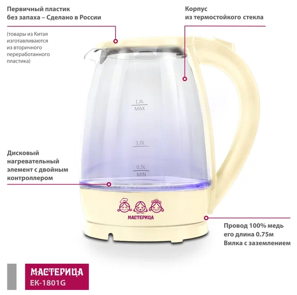 тип: чайник, материал корпуса: пластик/стекло, объем: 1.80 л, тип нагревательного элемента: закрытая спираль, дополнительные функции: поддержание тепла, особенности: вращение на 360 градусов, индикатор уровня воды, отсек для хранения шнура