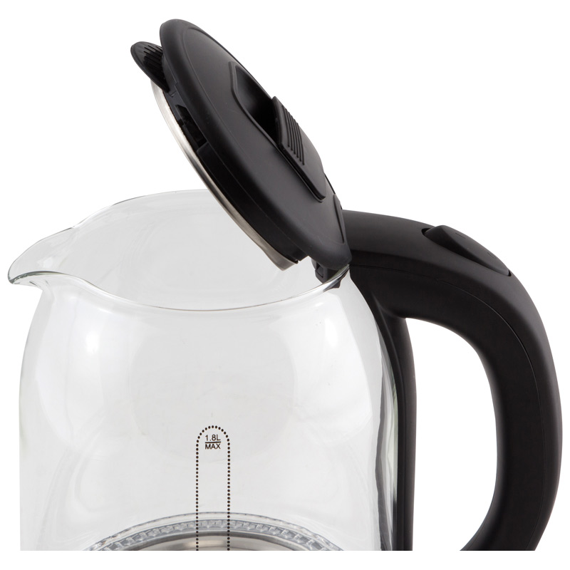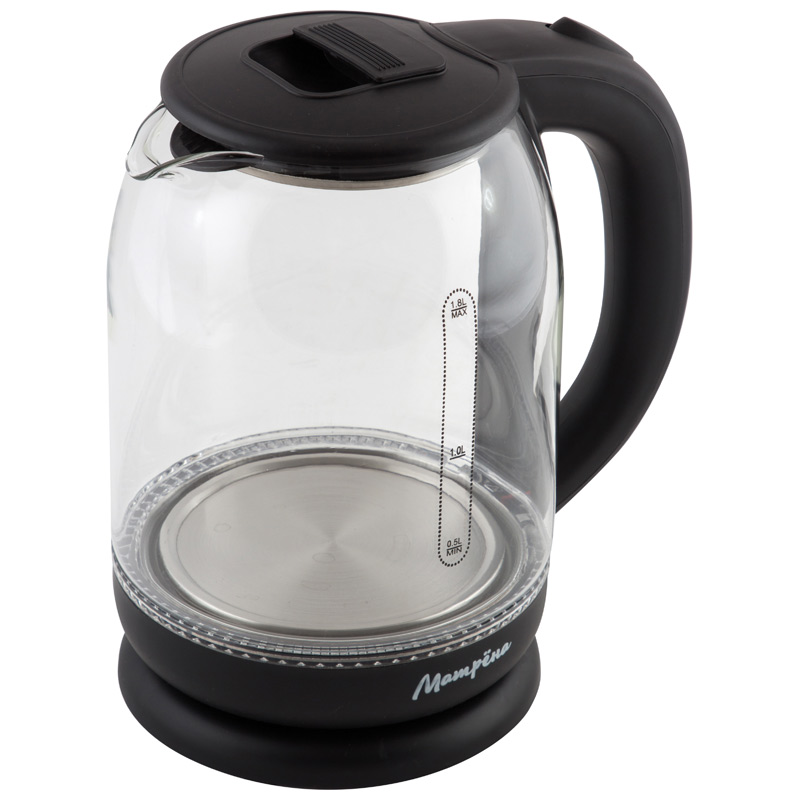 Электрический чайник предназначен для использования в офисе или дома.: Хорошо держит температуру, благодаря чему вода дольше остается горячей.: Современный дизайн впишется в любой интерьер.: Технические характеристики чайника: Объем 1,8 л: Корпус из термостойкого стекла: Шкала уровня воды: Внутренняя подсветка: Закрытый нагревательный элемент из нержавеющей стали: Поворот на подставке 360°: Защита от работы без воды : Автоматический выключатель: Место для хранения шнура: Мощность 1500 Вт: Цвет чёрный;