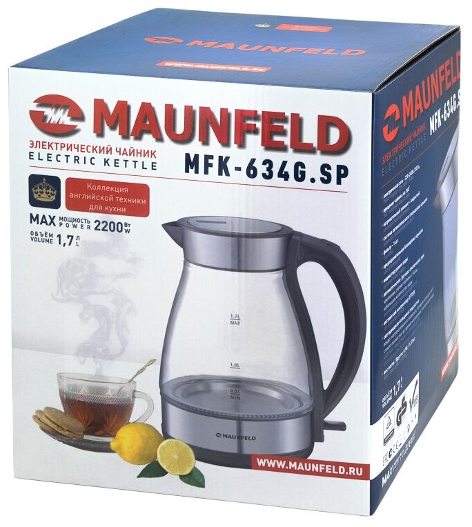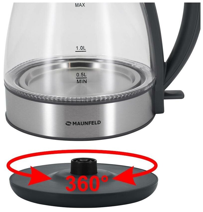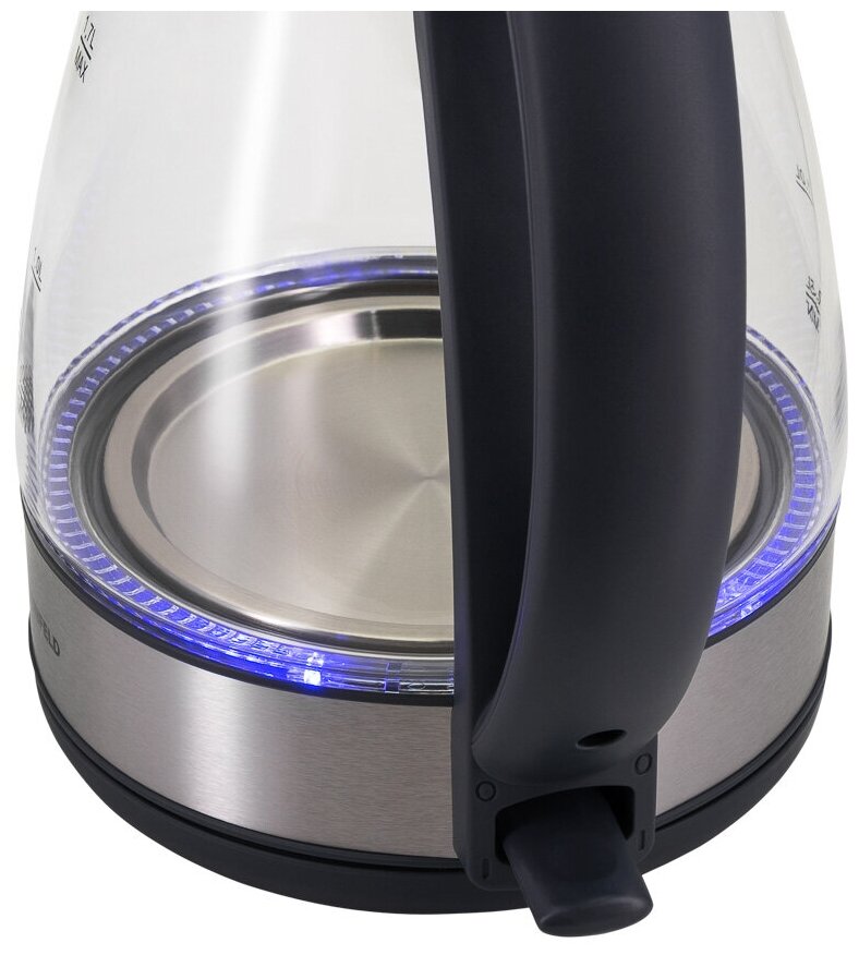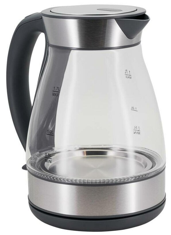 объем 1.7 л; мощность 2200 Вт; поддержание тепла; закрытая спираль; установка на подставку в любом положении; корпус из стали и стекла; подсветка корпуса