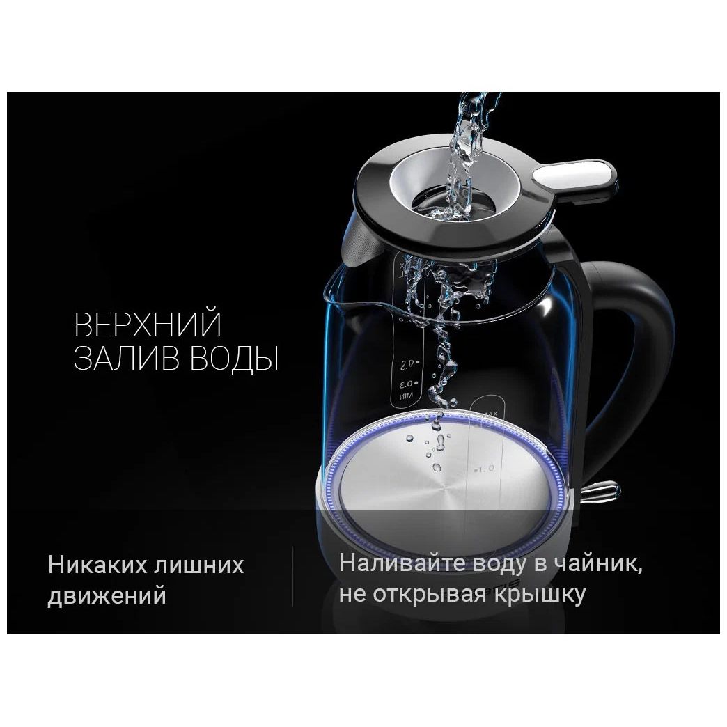Основные характеристики Тип электрочайник Объем, в литрах 1.5 Потребляемая мощность, в Вт 2200 Нагревательный элемент скрытый нагревательный элемент Индикация работы; уровня воды Звуковой сигнал Нет Внутренняя подсветка Да Шкала уровня воды Да Защита от включения без воды; от перегрева Фильтр от накипи в носике Да Электропитание от сети Управление Тип управления механический Подставка с электронным управлением Нет Поддержание температуры Нет Терморегулятор Нет Управление с мобильного устройства Нет Отложенный старт Нет Автоотключение Да Корпус Двойные стенки корпуса Нет Бесшумное закипание Нет Вращение на подставке на 360 градусов Да Внутренний заварник Нет Цвет черный; прозрачный Материал термостойкое стекло