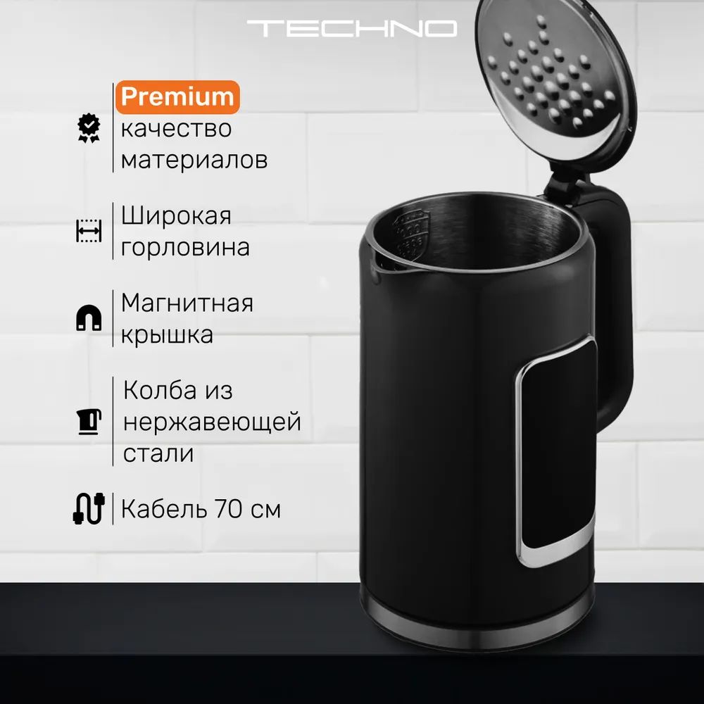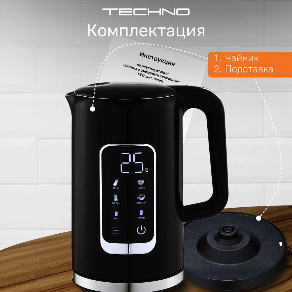 Технические характеристики : Объем, л : 1.7 : Мощность, Вт : 2100 : Материал корпуса : Пластик : Тип нагревательного элемента : Закрытая спираль : Системы защиты : Автоотключение : Длина шнура, м : 0.7 : Общие : Тип : Электрический чайник : Страна-изготовитель : Китай : Габариты и вес : Размеры, мм : 240х215х140 : Вес товара, г : 1250 : Особенности : Тип управления : Сенсорное : Подсветка : Да : Управление со смартфона : Нет : Конструкция чайника: Бесшумный, Вращение подставки на 360°, Двухслойный корпус, Дисплей, Длительное кипячение, Индикатор уровня воды : Особенности устройств для нагрева воды: Бесшумный, Вращение подставки на 360°, Выбор температуры нагрева воды, Двухслойный корпус, Поддержание постоянной температуры, Дисплей : Настройка температуры: Выбор температуры нагрева, Поддержание постоянной температуры : Дополнительные : Цвет : Черный, черный матовый ;