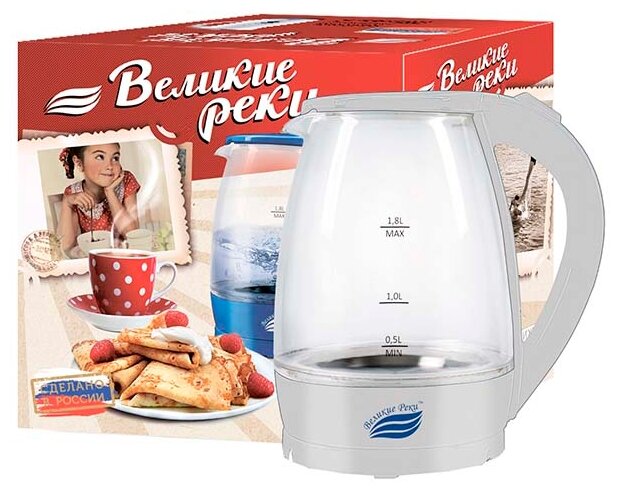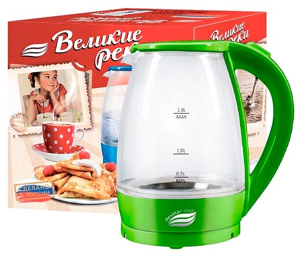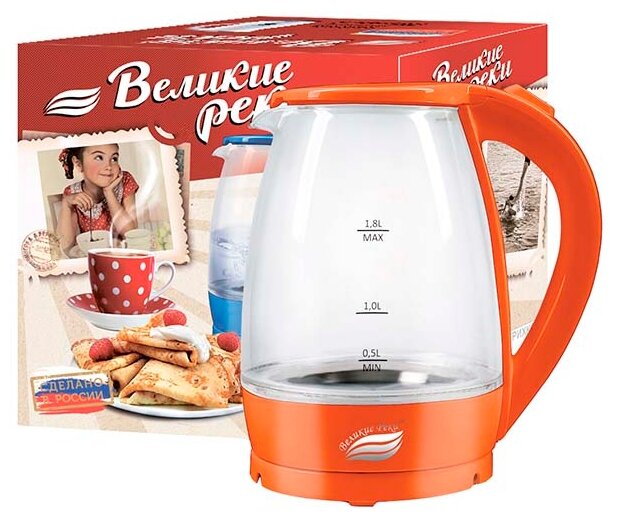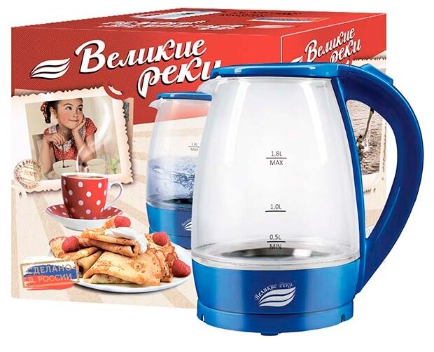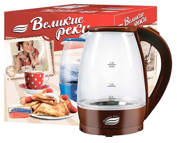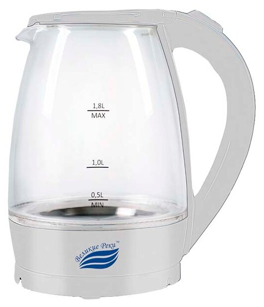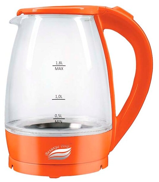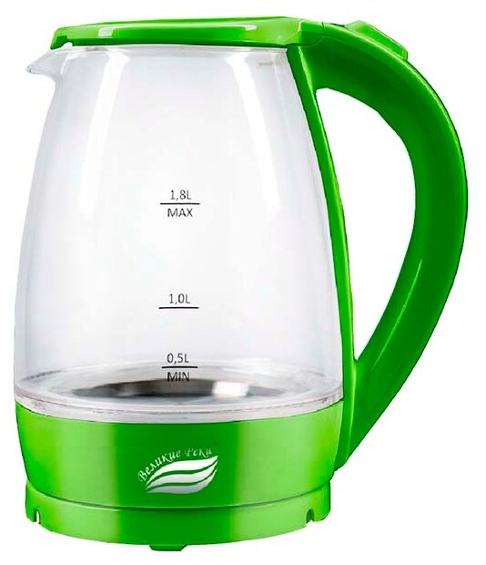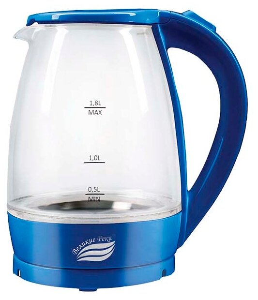 объем 1.8 л; мощность 1850 Вт; индикация включения, поддержание тепла; закрытая спираль; установка на подставку в любом положении; корпус из пластика и стекла; подсветка корпуса; вес 1.2 кг