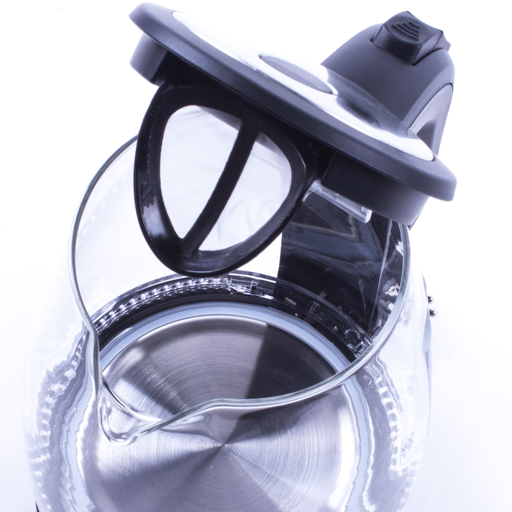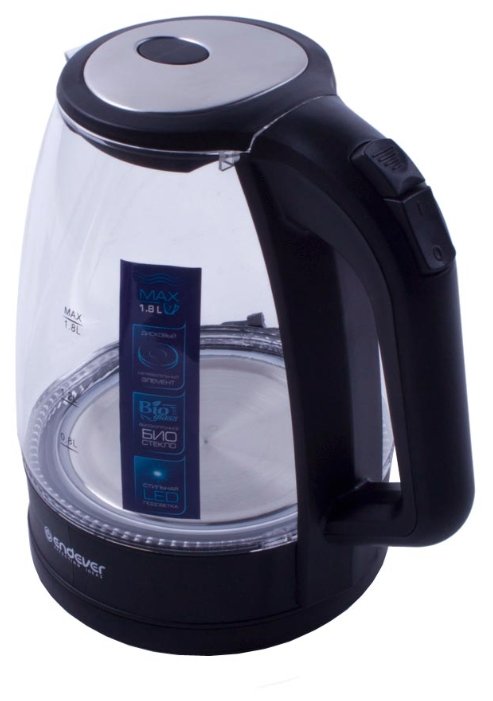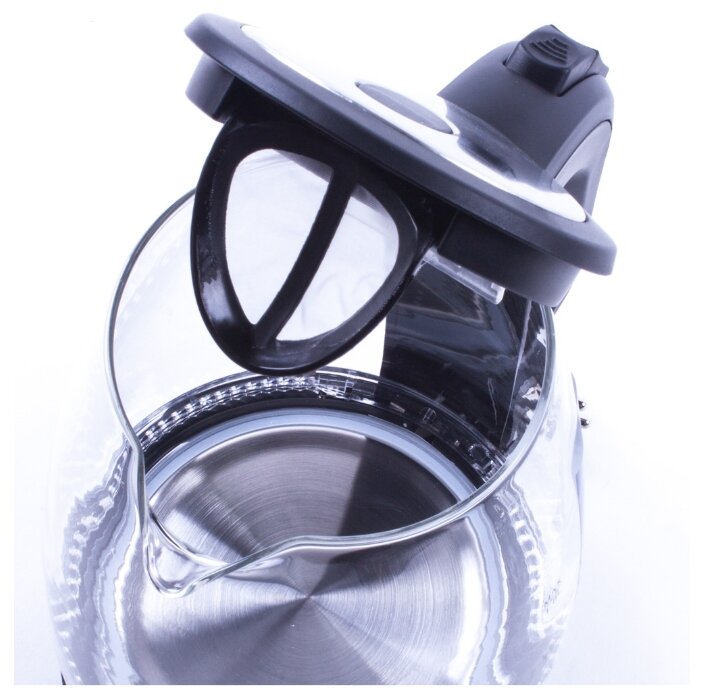 объем 1.8 л; мощность 2200 Вт; закрытая спираль; установка на подставку в любом положении; корпус из пластика и стекла; подсветка корпуса