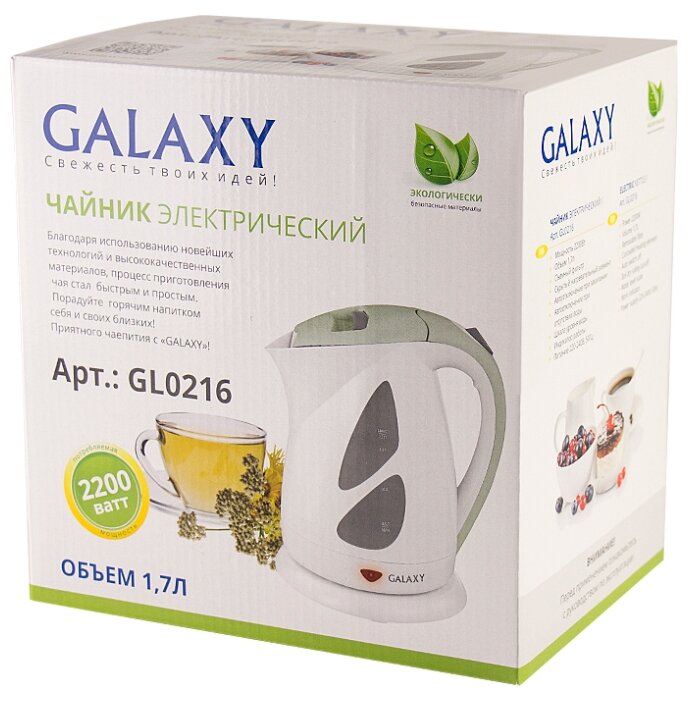 объем 1.7 л, мощность 2200 Вт, индикация включения, закрытая спираль, установка на подставку в любом положении, пластиковый корпус
