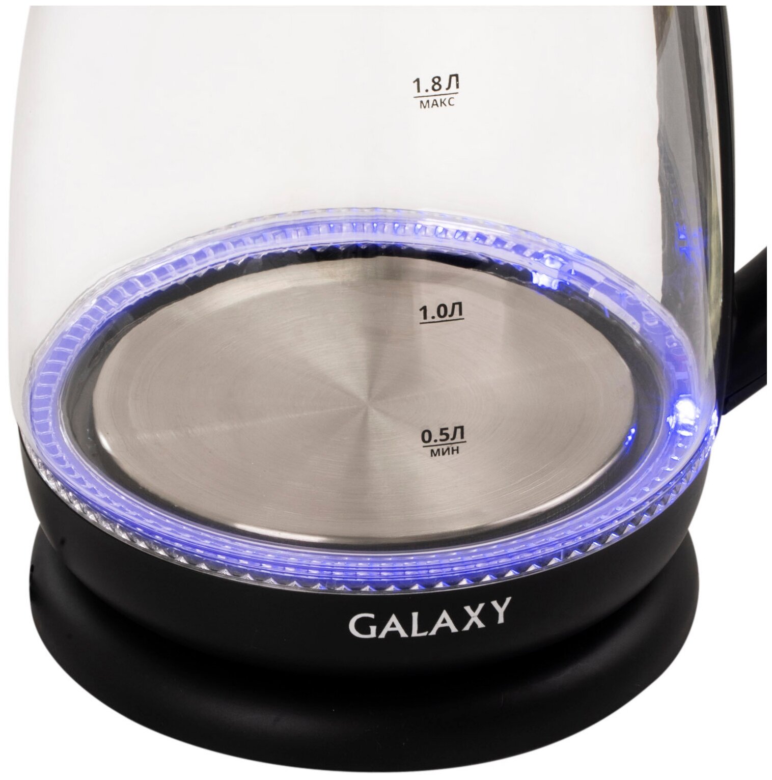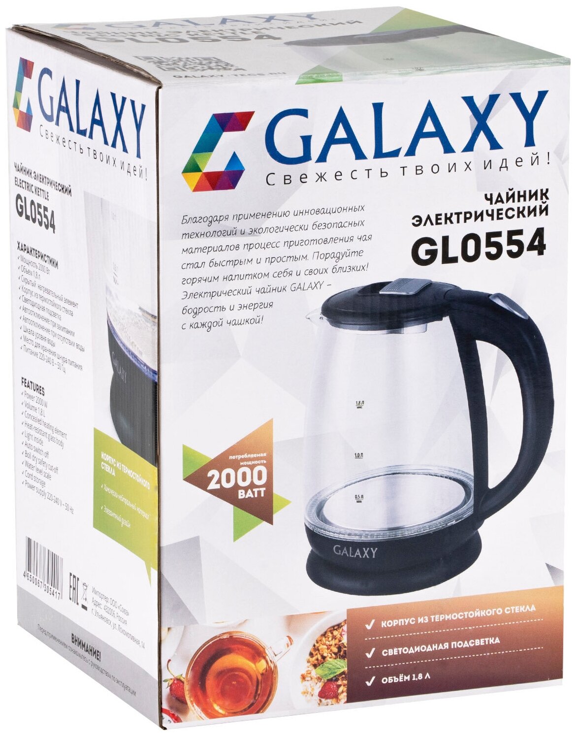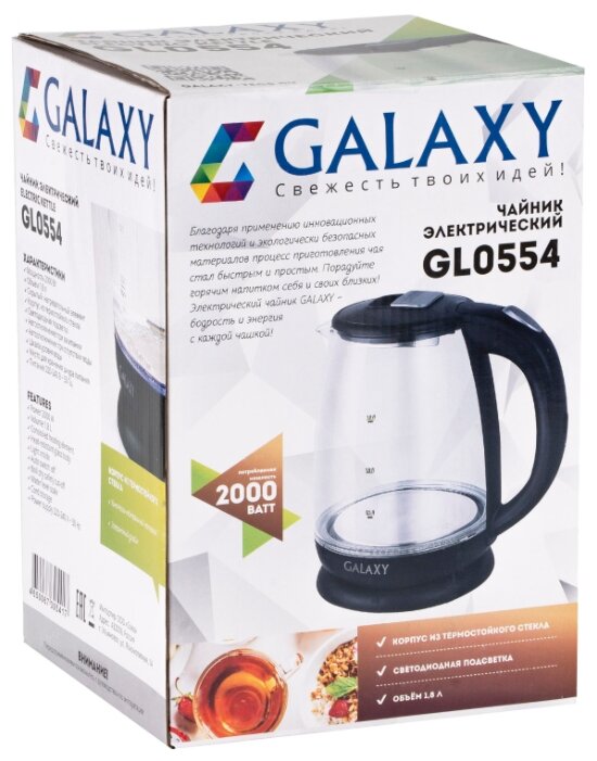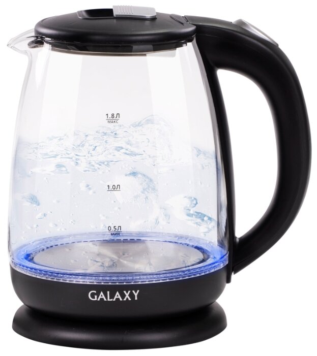 объем 1.8 л; мощность 2000 Вт; индикация включения; закрытая спираль; установка на подставку в любом положении; корпус из пластика и стекла; подсветка корпуса; вес 0.98 кг