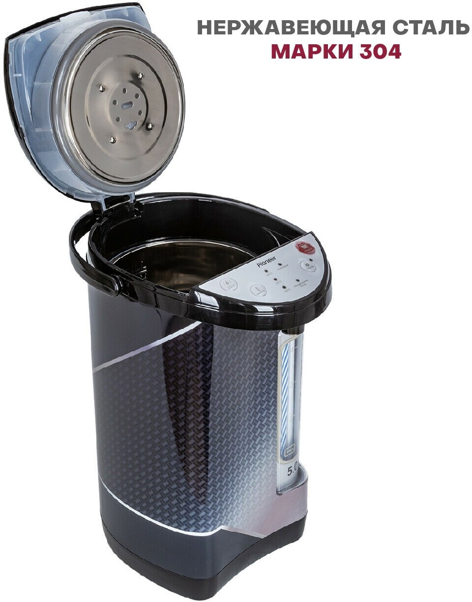 тип: термопот, материал корпуса: металл/пластик, объем: 5 л, тип нагревательного элемента: закрытый, дополнительные функции: поддержание тепла, особенности: вращение на 360 градусов, двойные стенки, индикатор уровня воды, индикация включения