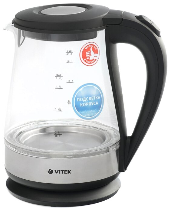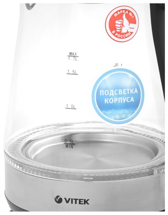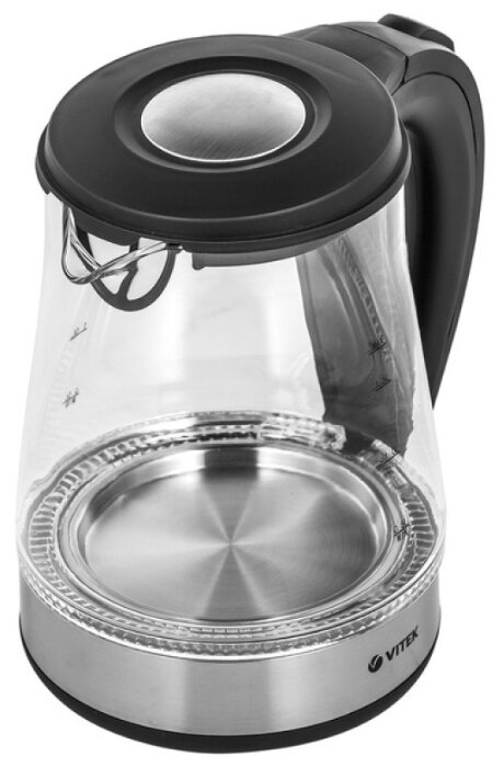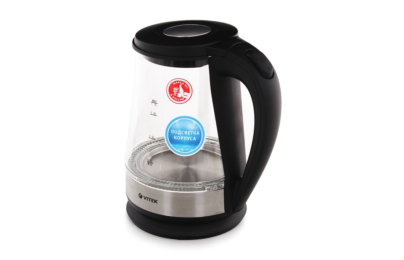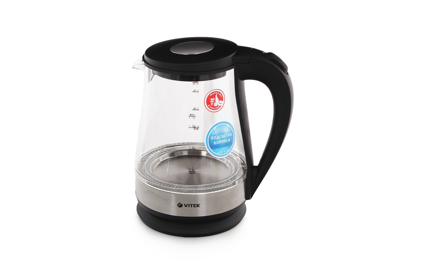 объем 1.7 л; мощность 2200 Вт; индикация включения; закрытая спираль; установка на подставку в любом положении; корпус из пластика и стекла; подсветка корпуса