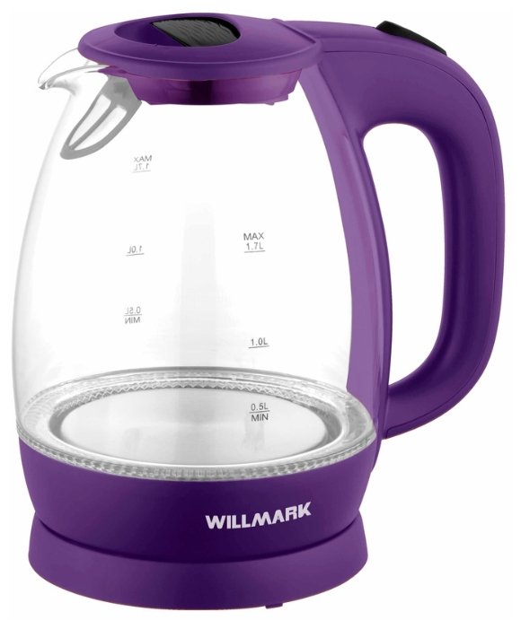 объем 1.7 л; мощность 2200 Вт; закрытая спираль; установка на подставку в любом положении; корпус из пластика и стекла; подсветка корпуса