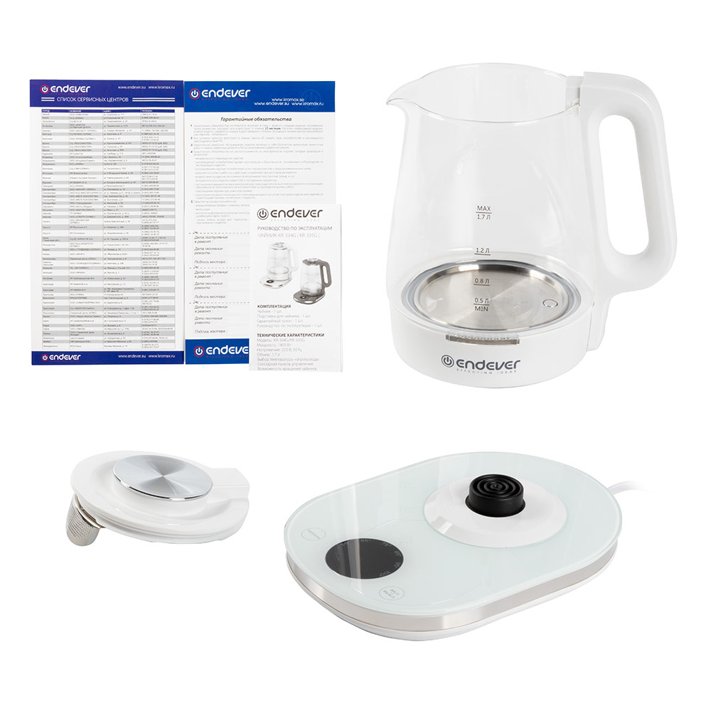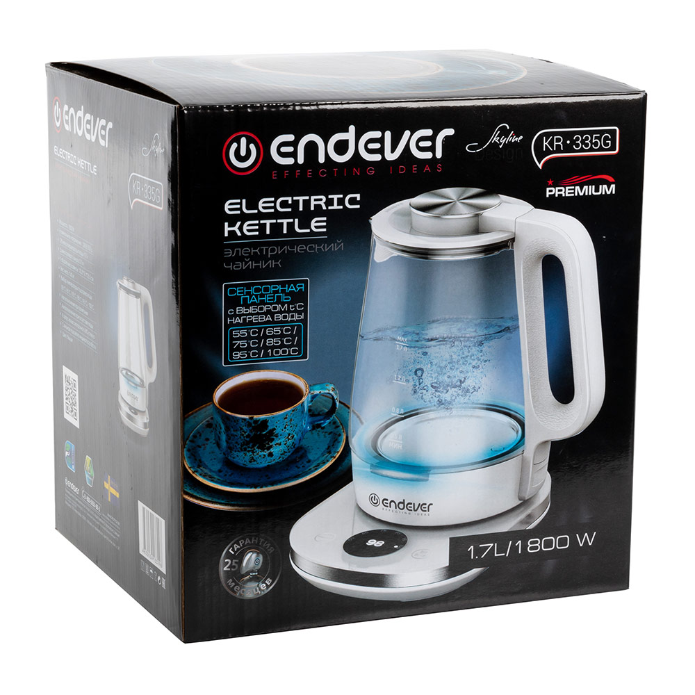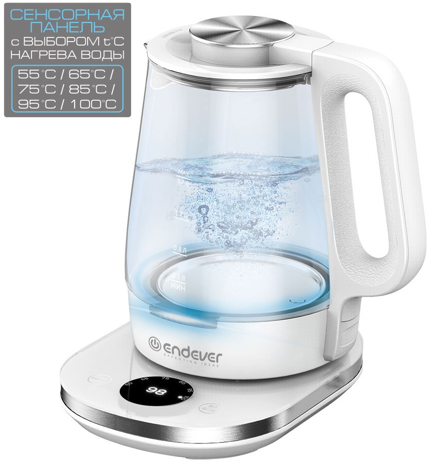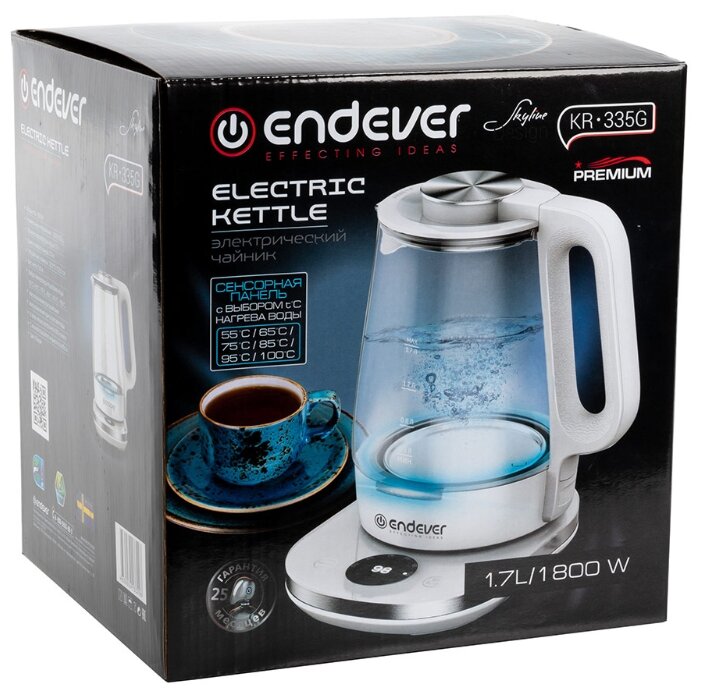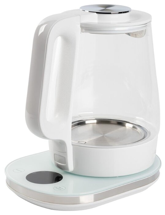 объем 1.7 л; мощность 1800 Вт; индикация включения, дисплей, сенсорное управление; закрытая спираль; установка на подставку в любом положении; корпус из пластика и стекла; выбор температуры нагрева воды; подсветка корпуса