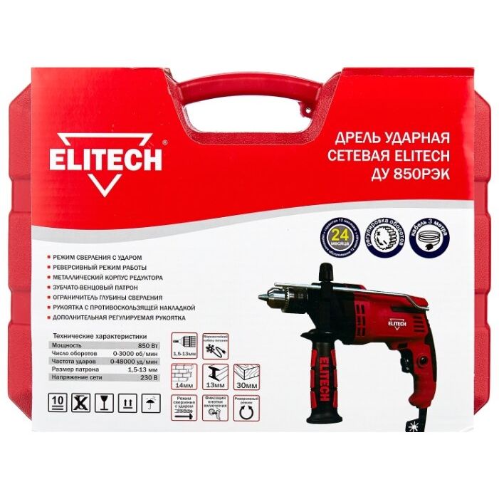 Тип инструмента: ударный ; Тип патрона: Ключевой ; Количество скоростей работы: 1 ; Диаметр патрона: 1.5-13 мм ; Число оборотов холостого хода: 3000 об/мин ; Потребляемая мощность: 850 Вт ; Макс. диаметр сверления (дерево): 30 мм ; Макс. диаметр сверления (металл): 14 мм ; Крепление патрона: 1/2 ; Количество ударов в минуту: 48000 уд/мин ; Плавный пуск: нет ; Подсветка: нет ; Поддержание постоянных оборотов: да ; Регулировка частоты вращения: да ; Длина кабеля: 3 м ; Размеры: 300x110x210 мм ; Вес: 2.4 кг