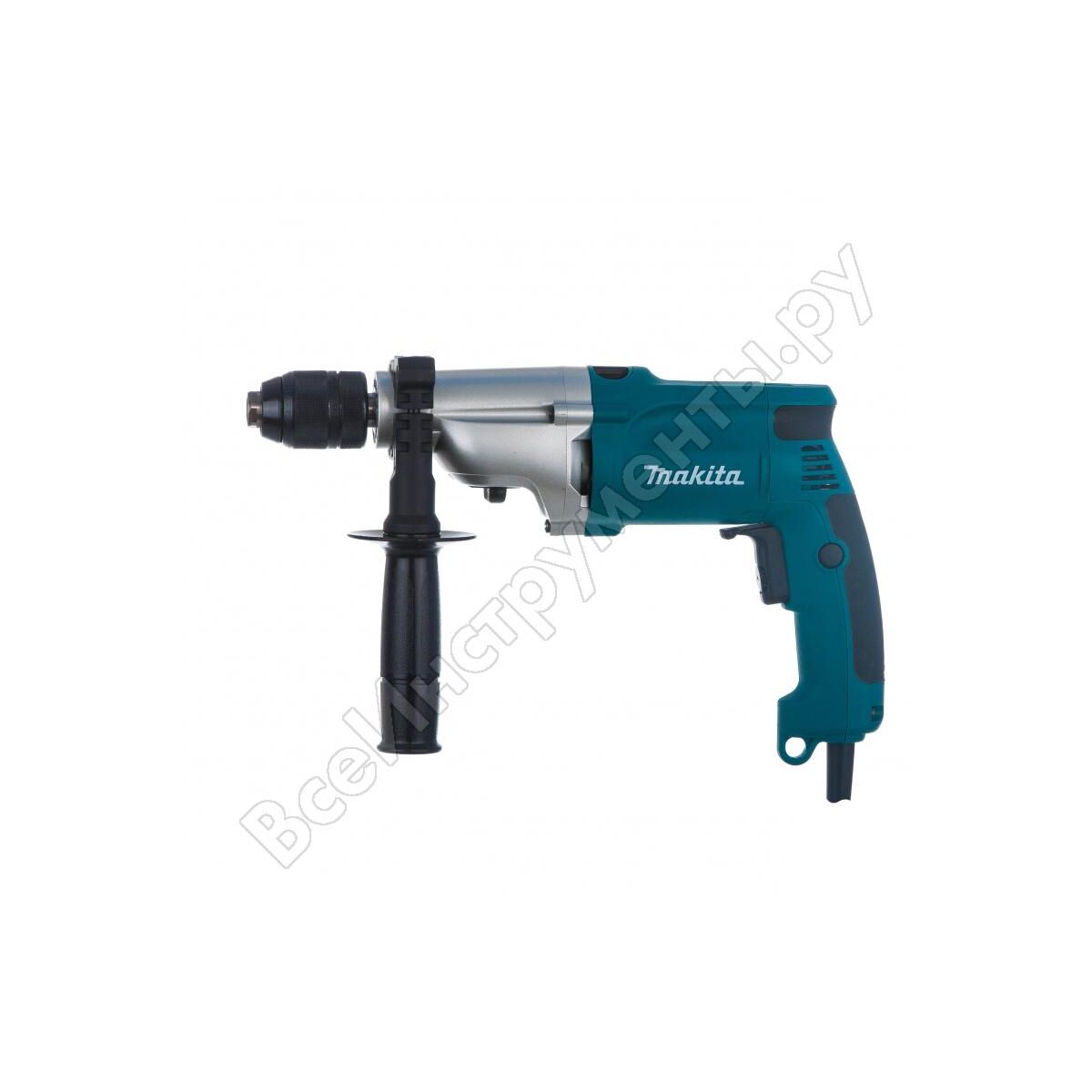 Редуктор двухскоростной ударной дрели Makita HP 2051 закрыт прочным металлическим корпусом. Инструмент имеет две скорости и два режима работы: сверление и сверление с ударом. С помощью реверса можно извлечь инструмент при застревании в материале.; Технические характеристики Makita HP 2051; Мощность, Вт 720; Тип патрона быстрозажимной; Крепление патрона 1/2; Число скоростей 2; Регулировка оборотов да; Наличие удара да; Наличие подсветки нет; Наличие реверса да; Max диаметр сверления (металл), мм 13; Мах диаметр сверления (дерево), мм 40; Мах диаметр сверления (кирпич), мм 20; Длина кабеля, м 2,5; Поддержание постоянных оборотов под нагрузкой нет; Габариты, мм длина 360; Вес, кг 2,3; Max размер патрона, мм 13; Комплектация чемодан/кейс; Частота вращения шпинделя, об/мин 0-1200; Частота ударов, уд/мин 1 скорость: 0-24000; 2 скорость: 0-58000; Автоматически отключающиеся при износе щетки нет