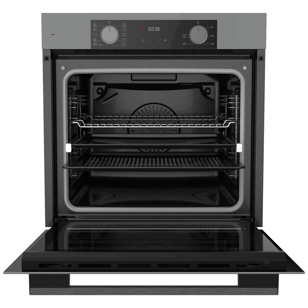 Общие характеристики: Цвет: серый: Тип духовки: электрическая: Установка: независимая: Объем духовки: 80 л: Мощность подключения: 3.3 кВт: Ширина: 59.5 см: Высота: 59.5 см: Глубина: 56.7 см: Режимы: Режимы нагрева: большой гриль, верхний нагрев, верхний нагрев + конвекция, верхний нагрев + нижний нагрев, гриль + конвекция, конвекция, малый гриль, нижний нагрев, нижний нагрев + конвекция: Функция СВЧ: нет: Гриль: да: Тип гриля: электрический: Конвекция: да: Управление: Управление со смартфона: нет: Переключатели: поворотные: Тип поворотных переключателей: механические: Сенсорный дисплей: есть: Особенности: Особенности конструкции: дисплей, подсветка камеры, телескопические направляющие, эмаль легкой чистки: Дополнительные функции: быстрый нагрев, размораживание, таймер: Электроподжиг: нет: Газ-контроль: нет: Дверца духовки: откидная: Очистка духовки: гидролизная: Число стекол дверцы духовки: два: Подробная комплектация: Стандартный противень, Решетка для гриля, Противень FryArt перфорированный: Дополнительная