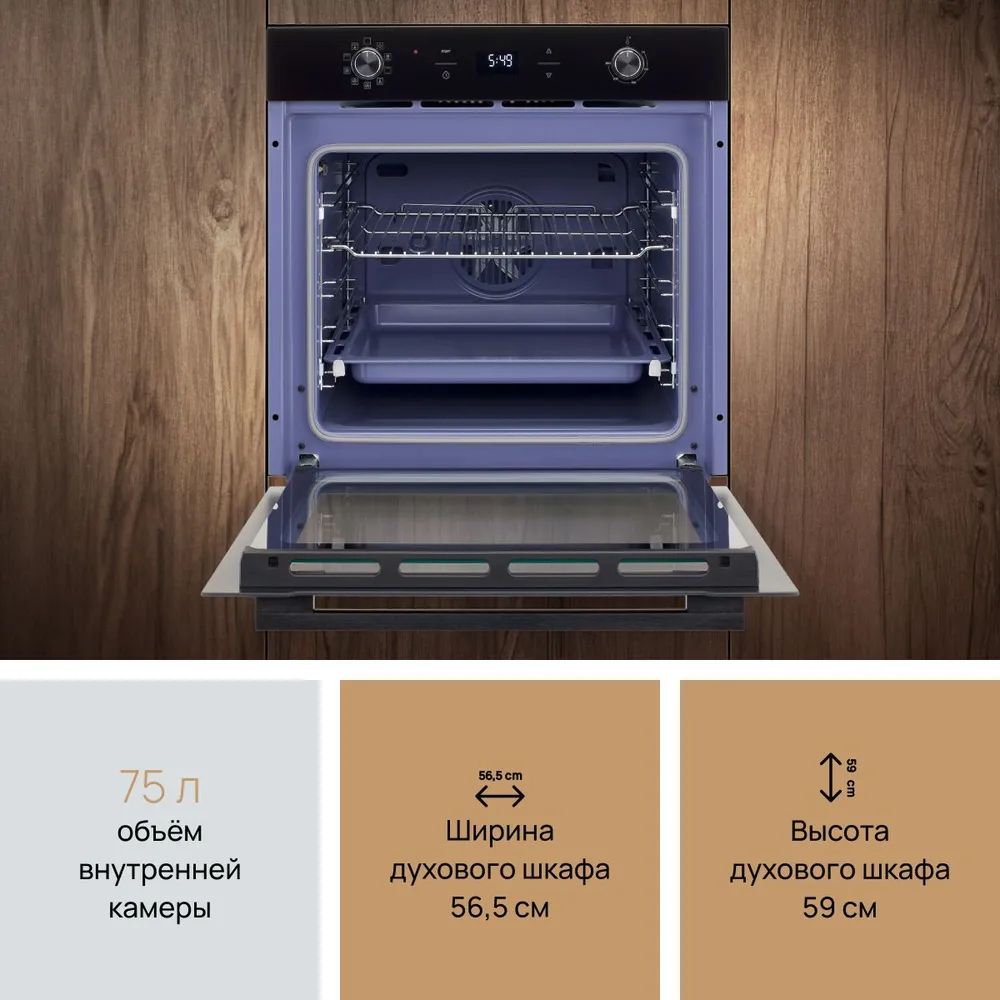 Общие Тип Духовой шкаф Размеры, мм 590 х 560 х 580 Страна-изготовитель Китай Функции Количество режимов работы 9 Системы защиты Защита от перегрева Подсветка духовки Галогеновая Телескопические направляющие На 1-м уровне Особенности духовки, плиты: Вентилятор охлаждения, Встроенные часы, Дисплей, Доводчик дверцы духовки, Термощуп Режимы работы: Верхний + нижний нагрев, Верхний + нижний нагрев + конвекция, Гриль Управление Управление духовкой Дисплей, Таймер, Утапливаемые переключатели Тип управления Сенсорное Таймер Звуковой Индикация Время до отключения Корпус Тип установки Независимая Внутреннее покрытие Эмаль Количество стекол дверцы духовки 3 Размер ниши, мм 565 х 585 х 590 Ширина встраивания, см 56.5 Направление открывания дверцы Откидная Высота, см 59 Ширина, см 56 Глубина, см 58 Вес, кг 34 Основные Объем духовки, л 75 Тип питания Электрический Потребляемая мощность, Вт 3202 Макс. температура, °С 250 Функционал духовки Гриль, Конвекция Телескопические направляющие духовки Да Дополнительные Цвет Черный,