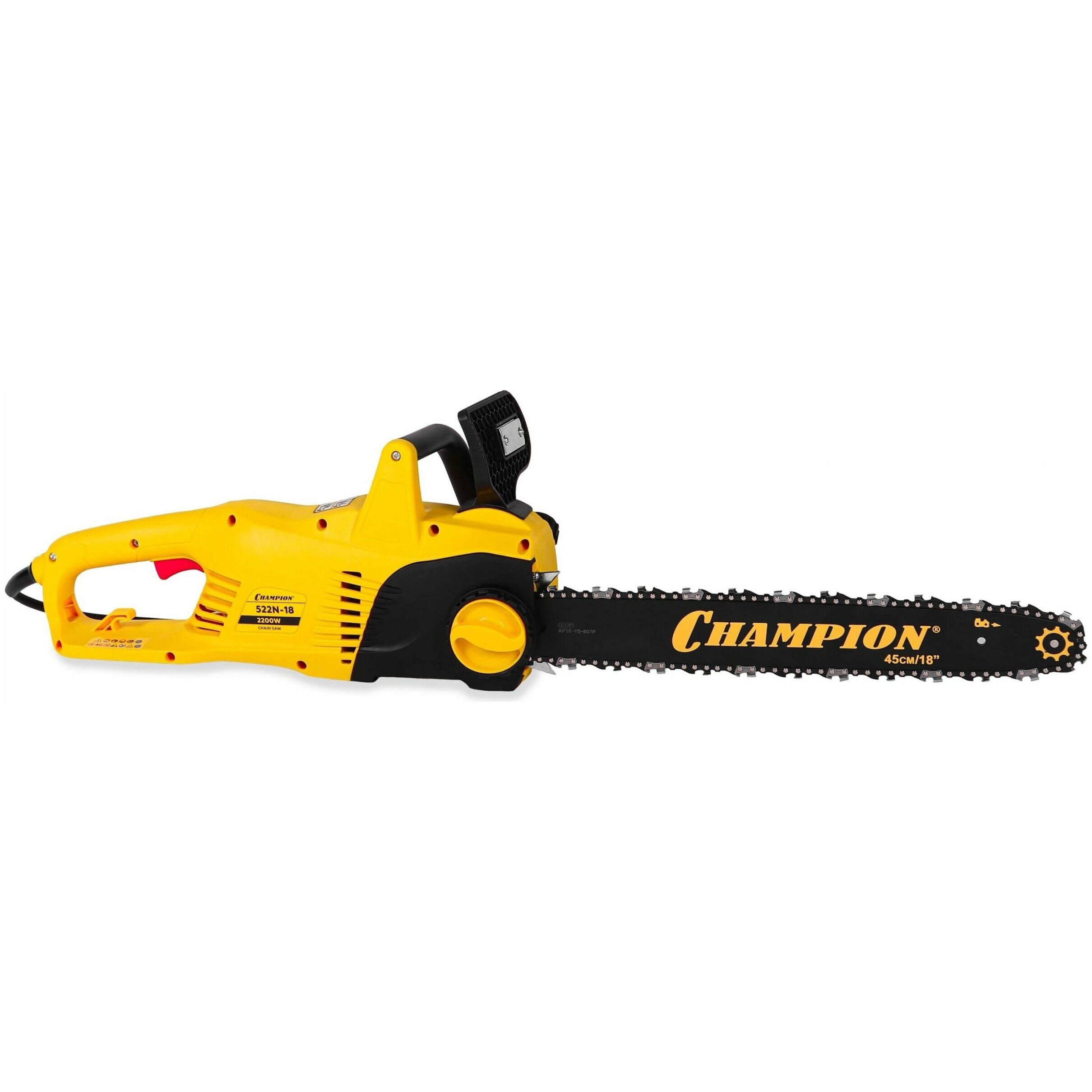 Общие характеристики; Тип двигателя; электрический; Мощность; 2200 Вт; Выходная мощность; 2200 Вт; Шаг цепи; 3/8 дюйма; Обработка; Длина шины; 45 см; Максимальная длина шины; 45 см; Производитель ность; Скорость вращения; 8000 об/мин; Дополнительно; Функции и возможности; тормоз цепи, регулировка натяжения цепи без инструмента; Комплект поставки; Электропила – 1 шт. Руководство по эксплуатации – 1 шт. Шина – 1 шт. Цепь – 1 шт. Защитный чехол для шины – 1 шт. Масло для смазки шины и цепи 0.1 л – 1 шт.; Габариты (ШхВхГ); 250x205x520 мм; Вес; 4.1 кг; Особенности; Продольное расположение двигателя Металлический зубчатый упор Бесключевой механизм натяжения цепи Металлические шестерни для надежной передачи крутящего момента Поводок пробки маслобака Масло для смазки цепи и шины в комплекте Пластиковый чехол - защита пильной гарнитуры Champion 522N-18 во время транспортировки и хранения