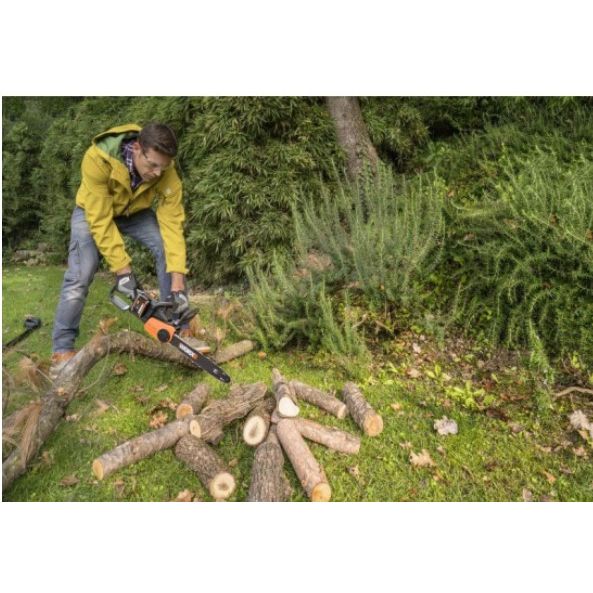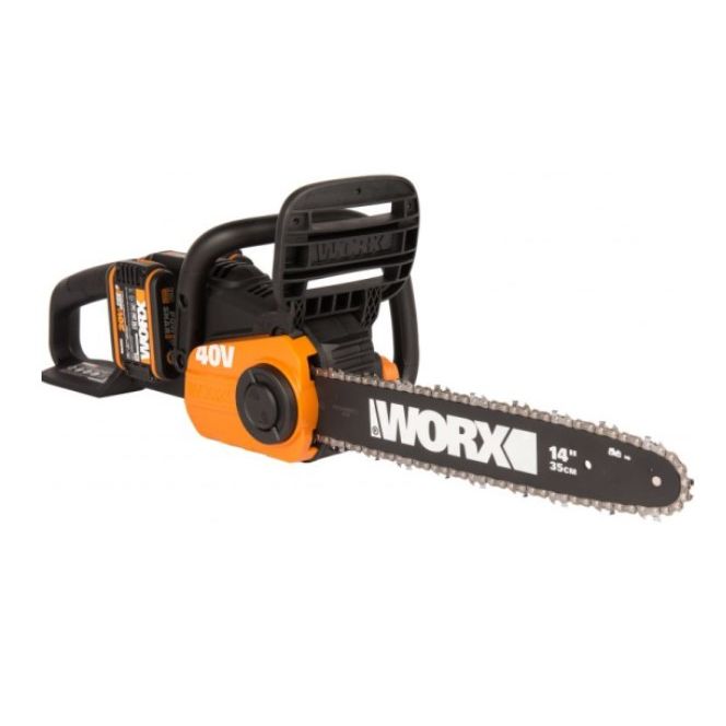 Аккумуляторная цепная пила с бесщеточным WORX WG384E, работающая от двух аккумуляторов 20В. Автоматическая система натяжения цепи гарантирует оптимальное натяжение при затягивании. Бесщеточный двигатель обеспечивает более высокую мощность, увеличенное время работы и длительный срок службы. Система замены цепей без использования дополнительных инструментов. Автоматическая подача смазки во время работы с окном уровня масла. Электронный тормоз цепи с быстрой остановкой для аварийной ситуации. Зарядное устройство с двумя портами может заряжать одновременно 2 аккумулятора. Аккумулятор PowerShare® взаимозаменяем с другими инструментами 20V MAX WORX. Технические характеристики: Батарейный отсек для работы одновременно от двух аккумуляторов Обороты без нагрузки: 4600 об/мин Длина шины: 35 см Скорость цепи: 8 м/с Время зарядки: 1 ч. Вес устройства: 4,7 кг. Длина шины: 14"/35см Шаг цепи: 3/8 (0.375) дюйм Ширина паза: 1.1 мм Скорость вращения цепи: 8 м/с Тип аккумулятора: Li-ion Напряжение аккумулятора: 20 В Количество