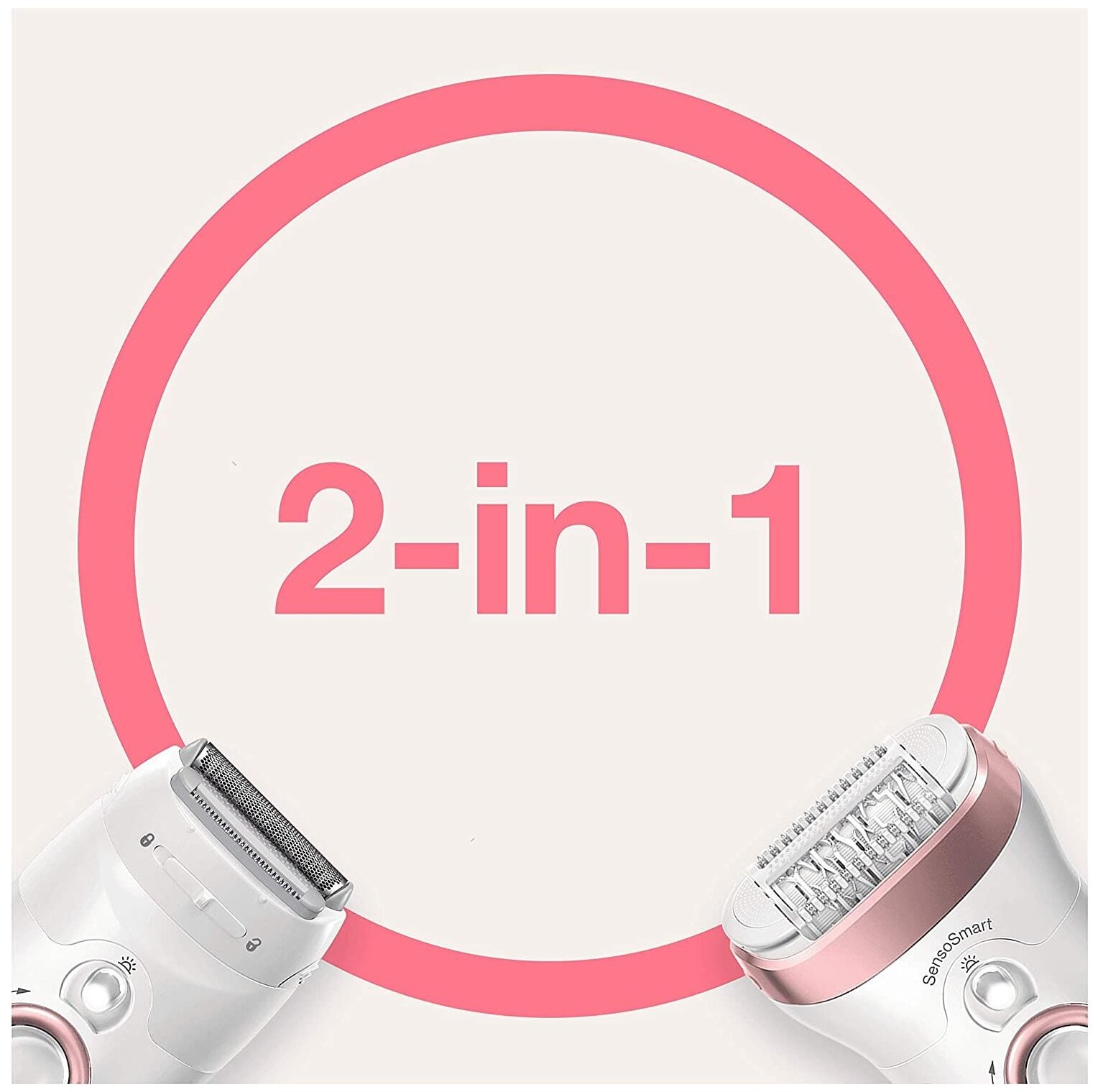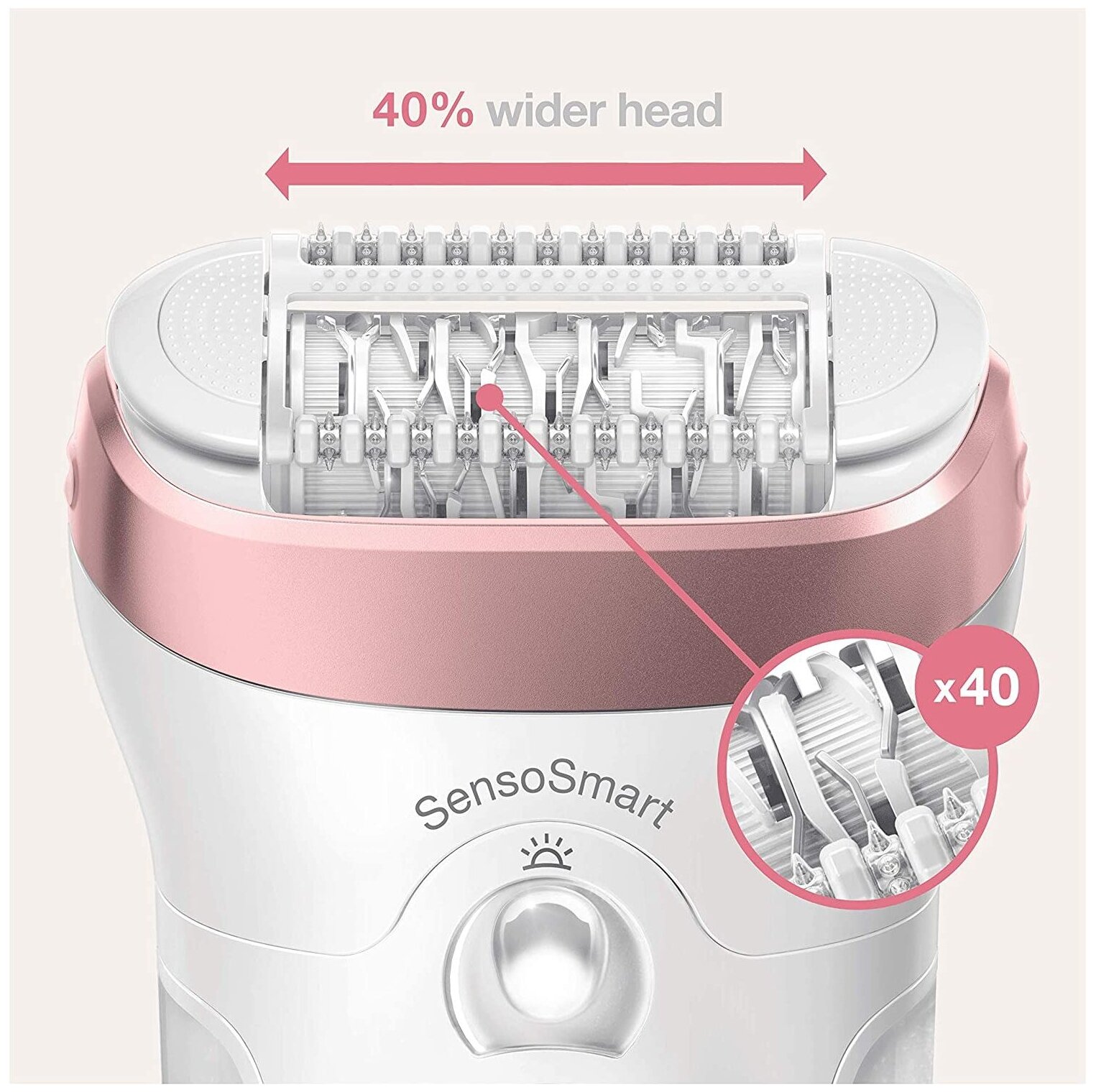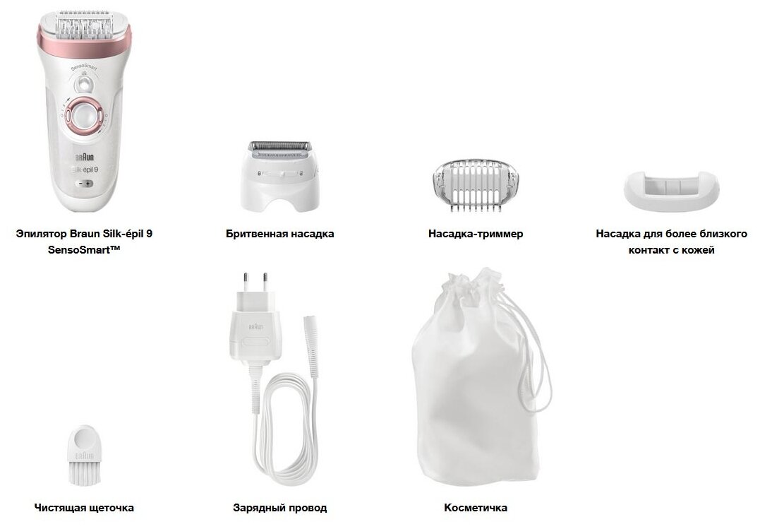 - Подробная комплектация: эпилятор Braun Silk-epil 9 SensoSmar, насадка для более близкого контакта с кожей, бритвенная головк