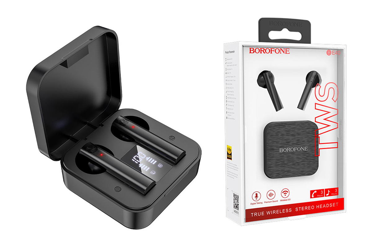 BOROFONE BE40 Triumph TWS, беспроводные BT наушники, BT 5.0, с зарядным чехлом 300mAh, 3 часа в режиме разговора или воспроизведения музыки, поддержка переключения ведущий / ведомый 1. BT v5.0, чип: Blue trum. 2. Емкость батареи: зарядный чехол 300mAh, левый и правый наушник 30mAh. 3. В режиме разговора или воспроизведения музыки: 3 часа. 4. В режиме ожидания: 200 часов. 5. Размеры: 55*53*21 мм. Общий вес: 39г. Один наушник: 3 г. 6. Поддержка переключения ведущий / ведомый, LED цифровой дисплей уровня заряда на зарядном чехле.